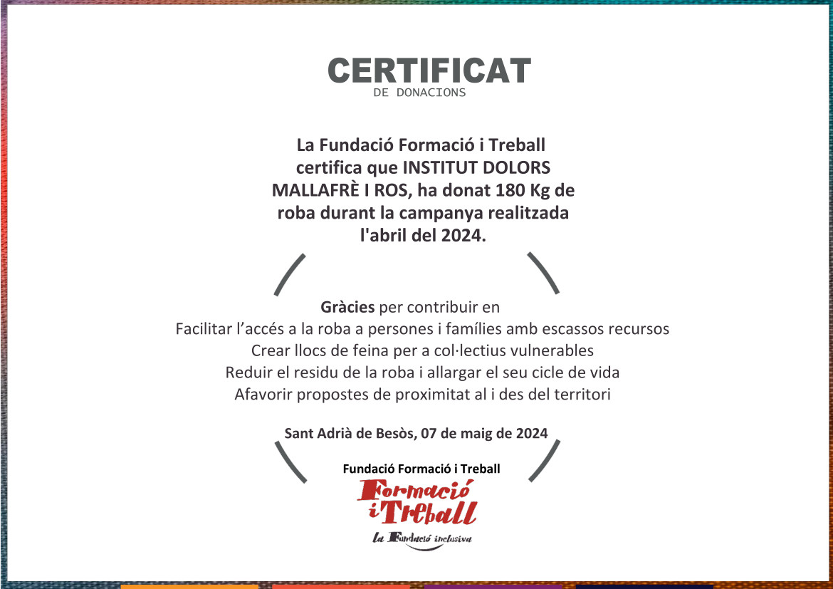 Des de l’Agenda 21 i l’equip LED de l’institut volem agrair a tota la comunitat educativa i a totes les famílies la vostra participació en la campanya de recollida de roba que es va dur a terme a l’institut el passat mes d’abril. La finalitat d’aquesta campanya era col·laborar amb Càritas a través del Projecte de Formació i Treball, i donar-li una nova vida a la roba que ja no utilitzem. La recollida va ser tot un èxit i ja ens ha arribat el nostre certificat de la donació on podeu veure que vam recollir 180 kg de roba!