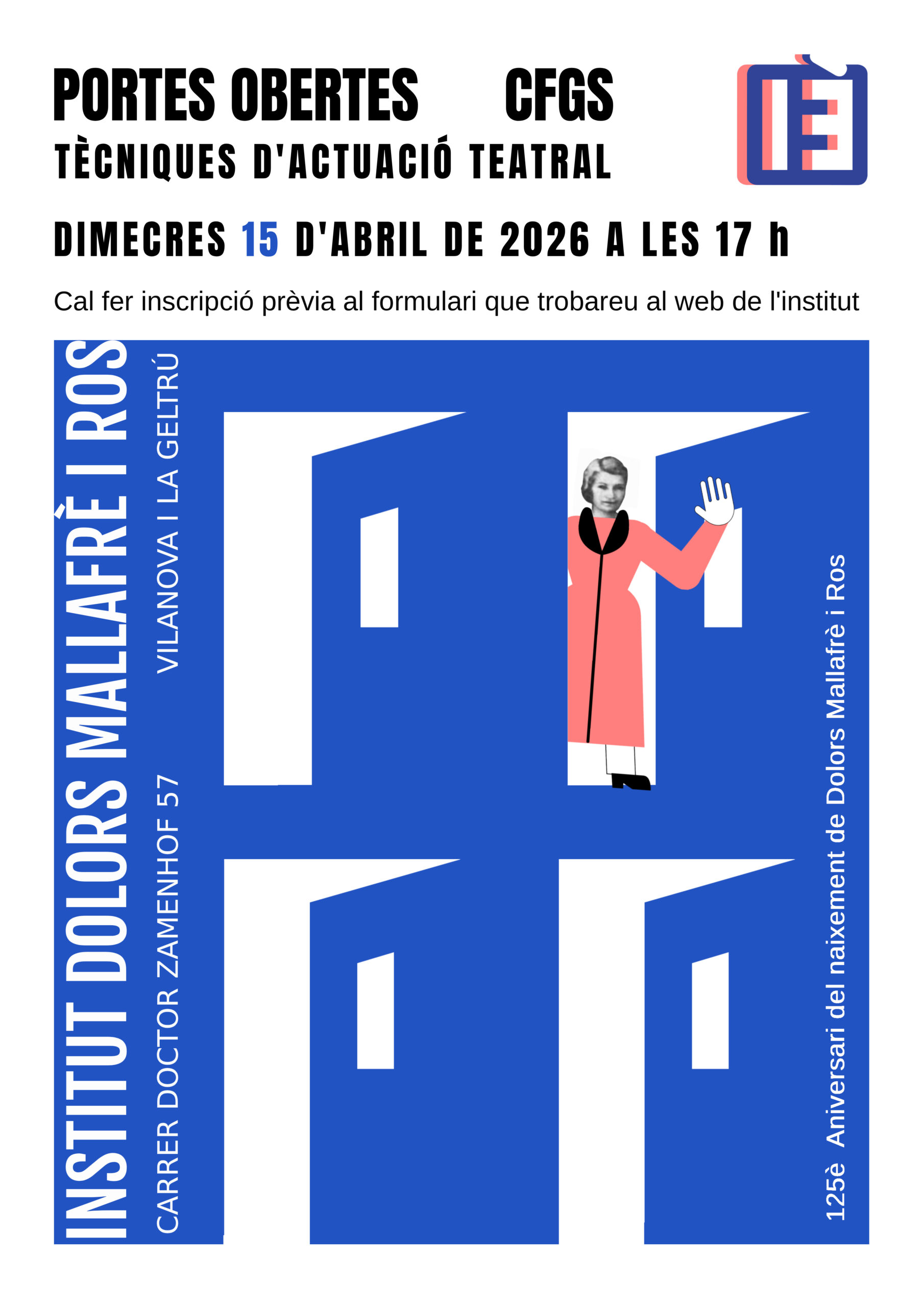 El proper dimecres 15 d’abril, de 17h a 19h, tindrà lloc la jornada de portes obertes del CFGS Tècniques d’Actuació Teatral.