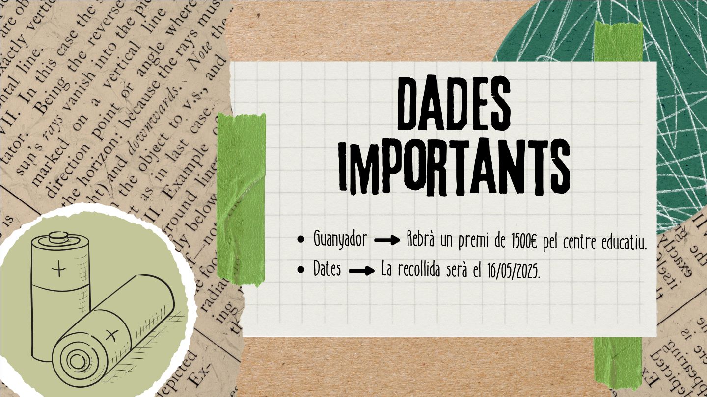 Aquesta iniciativa té com a objectiu recollir el mà xim de piles possibles perquè no perjudiquin el nostre medi ambient. A més, el centre que aconsegueixi recollir més piles rebrà un premi de 1.500 euros per a la compra de material escolar i/o esportiu o per a activitats educatives.