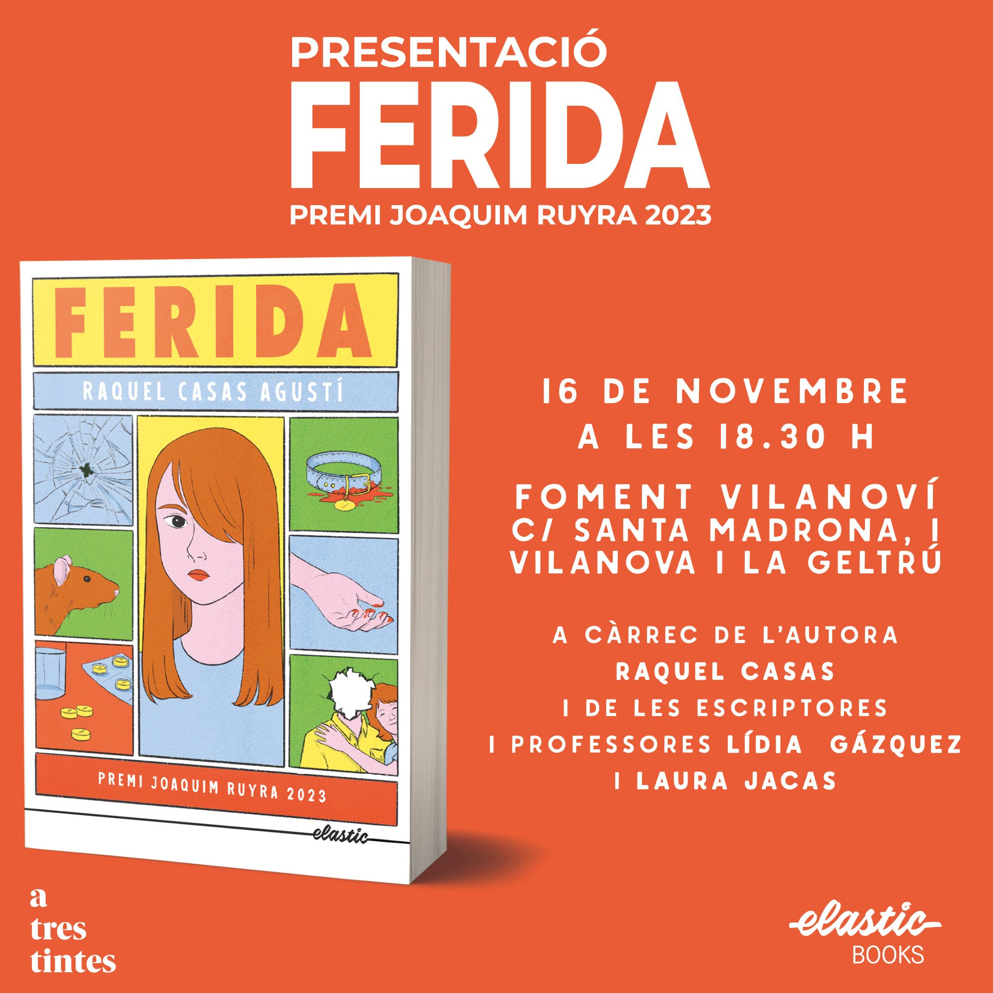 Aquest dissabte 16 de novembre a les 18.30 us esperem al Foment Vilanoví on la nostra professora Raquel Casas presenta ‘Ferida’. L’acompanyaran Laura Jacas i Lídia Gàzquez. No ens ho perdrem!