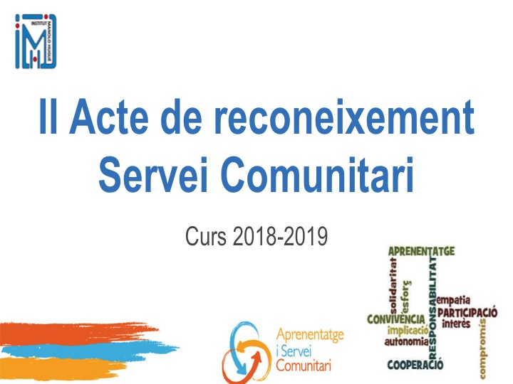 S’ha fet el II Acte de Reconeixement i cloenda del Servei Comunitari. Ha iniciat l’acte el Director Jaume Balart agraint a les entitats la seva col·laboració amb l’institut i a l’alumnat per la seva implicació amb el servei comunitari.