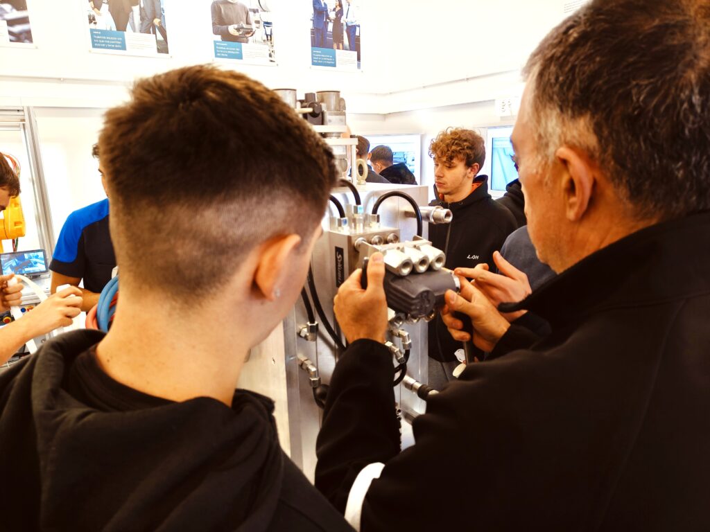 Entre aquestes solucions, els estudiants van examinar de prop els sistemes de connexió de fluids per als motlles, tant les versions de connectors individuals com els sistemes de plaques multiconnexió, així com les nostres solucions de tecnologia d’embridat magnètic. Aquestes eines representen un avanç significatiu per a millorar tant l’eficiència com la seguretat en els processos productius. Els alumnes van tenir l’oportunitat d’observar el seu funcionament directament en el nostre showroom.
