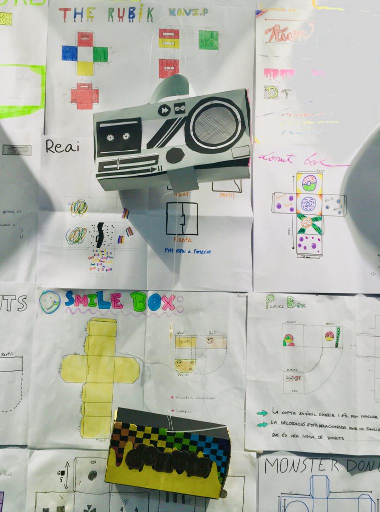 Un curs més l’alumnat de 1r ESO ha treballat el disseny d’embalatge durant la 1a avaluació. Al llarg d’aquests tres mesos hem aprés què és el disseny, els passos que hem de seguir des de la idea fins a la construcció, hem dissenyat una capsa per a dos donuts, la hem construïda i dibuixat els seus plànols. Els resultats han sigut molt originals, mireu quines capses més xules!