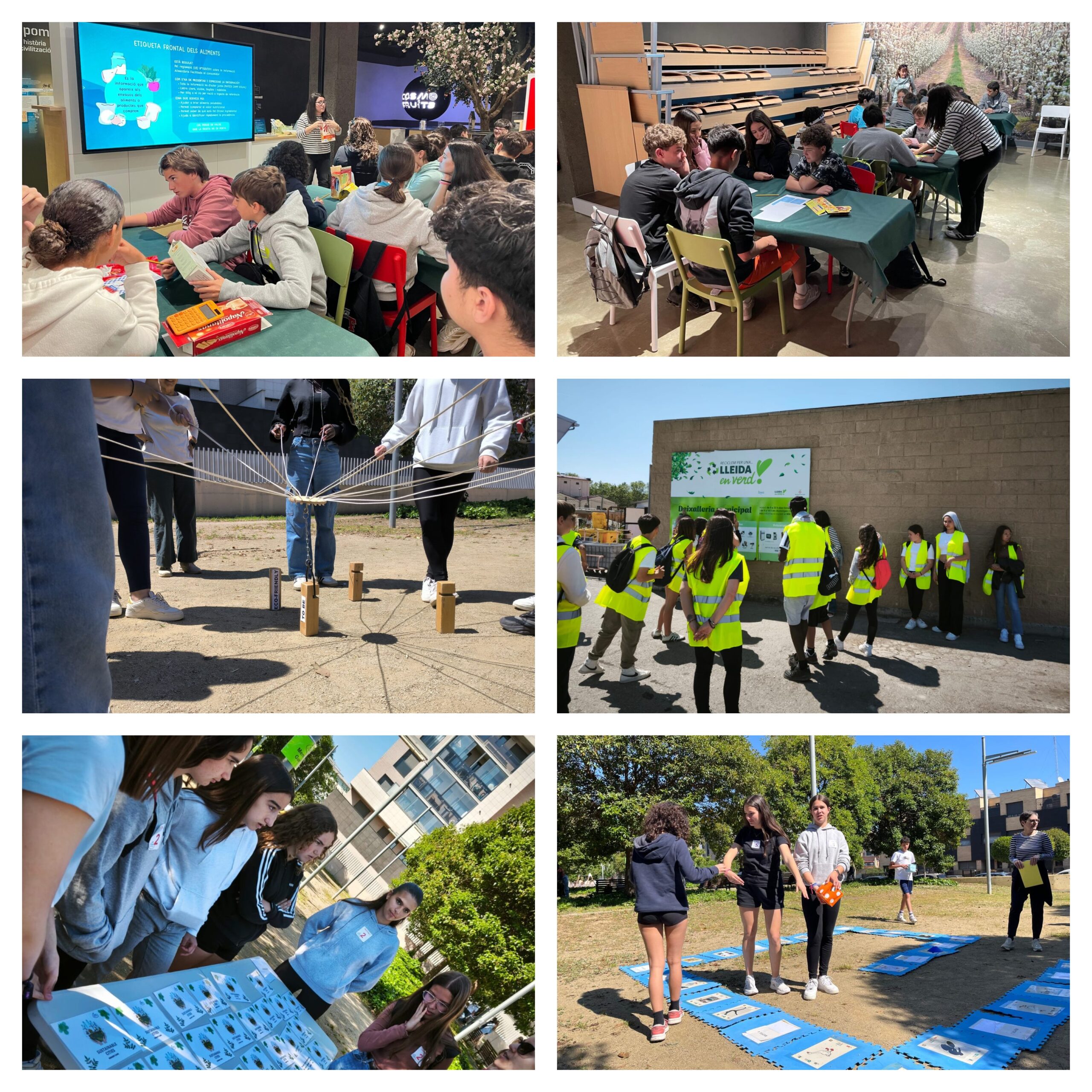 Durant la trobada, l’alumnat va participar en jocs col·laboratius per repassar els conceptes, vocabulari i idees treballades al llarg del projecte, i també en tallers pràctics dinamitzats per diverses entitats i organitzacions com ILNET, el Banc dels Aliments, Afrucat – Cosmofruita i Troballes.