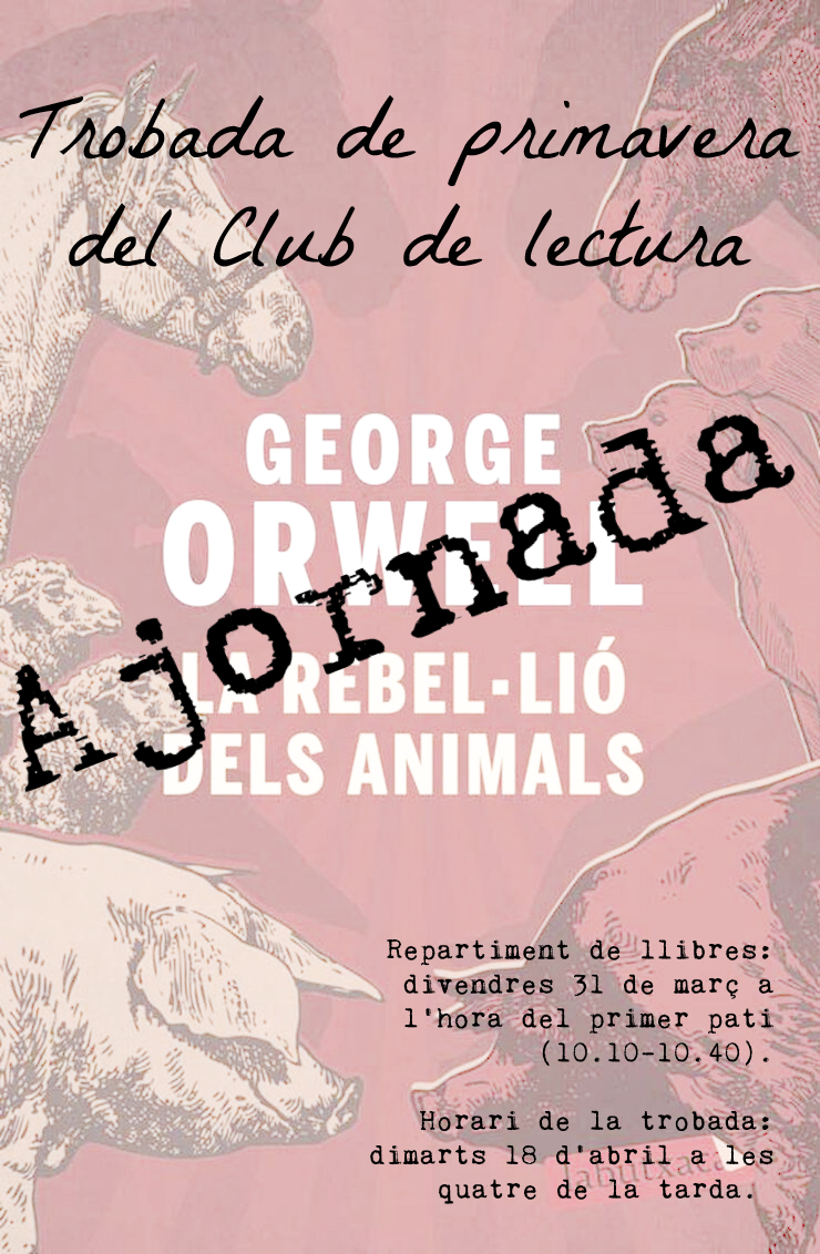 Ja tenim a tocar les vacances de primavera i des de la Biblioteca del Rúbies hem tornat a organitzar una trobada del Club de lectura. Aquesta vegada llegirem el clàssic universal “La rebel·lió dels animals” de George Orwell. A partir d’aquesta lectura, dimarts 18 d’abril, de 4 a 5 de la tarda a la biblioteca del nostre institut, farem la trobada per parlar-ne.
