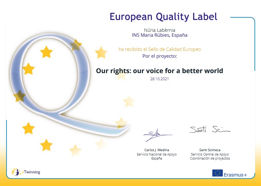 L’Institut Maria Rúbies ha estat guardonat amb el Segell de Qualitat Europeu per l’excel·lent tasca realitzada en el projecte ” Our rights: our voice for a better world” d’ eTwinning. El treball del nostre alumnat i del centre, ha estat reconegut al nivell més alt europeu.