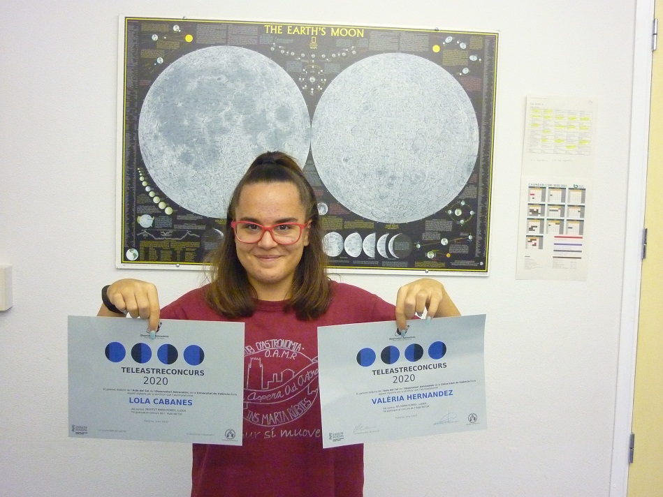 1.- Yaiza Cantillo + Mar Enríquez (3r ESO): guanyadores al “teleastroconcurs 2020” de l’aula del cel de la Universitat de València, amb el vídeo: “Desmuntant la conspiració: no hem anat a la lluna”: https://www.youtube.com/watch?v=6gjOR2jDkfQ