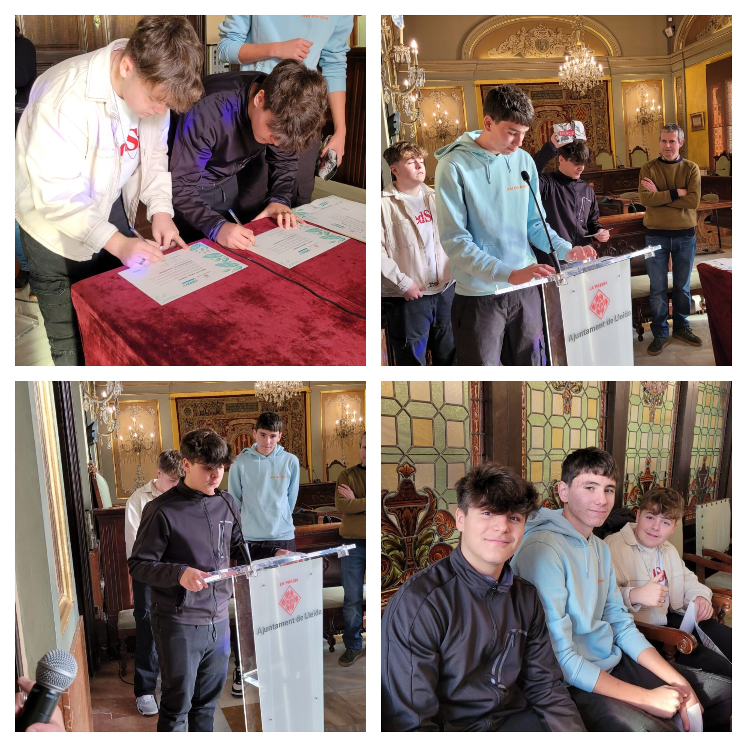 El passat dijous, 16 de gener, un grup d’alumnes de 3r d’ESO va participar en l’Acte de Signatura de Compromís de les Escoles Sostenibles de Lleida, celebrat al Saló de Plens de la Paeria. Com a representants del centre, van explicar davant altres escoles el projecte ambiental que s’està duent a terme al nostre institut, reafirmant així el nostre compromís amb la sostenibilitat.