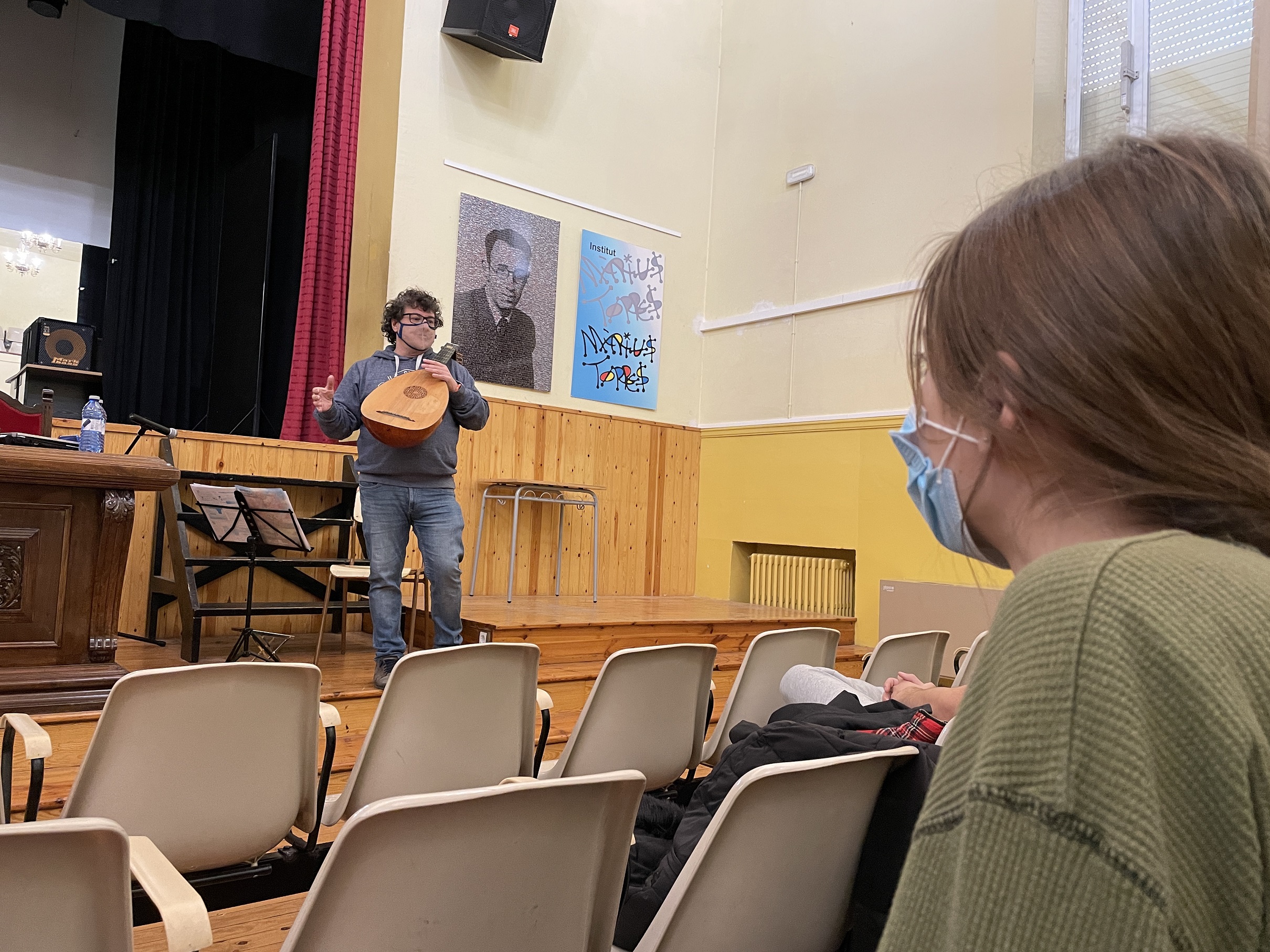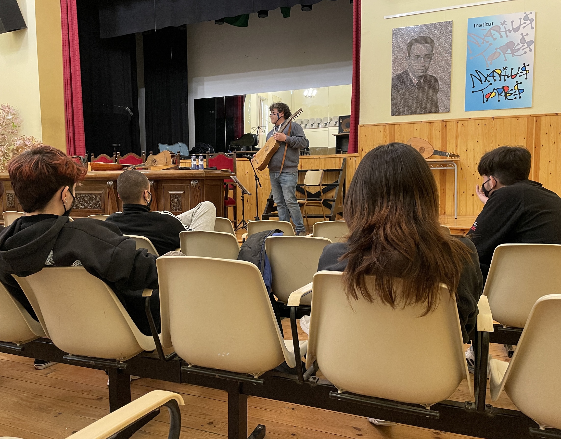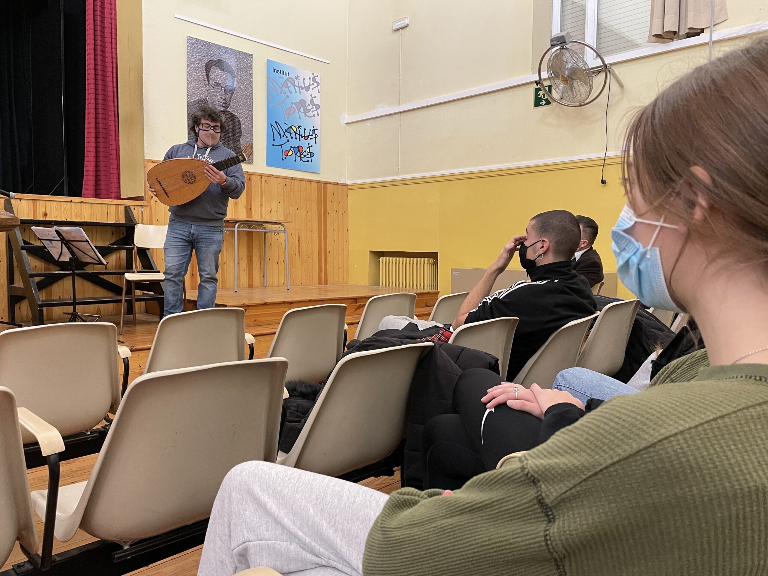 El passat divendres 21 de gener vam tenir el plaer de comptar amb la presència del prestigiós especialista en instruments renaixentistes i barrocs al nostre centre. En una xerrada centrada en els instruments de corda polsada en aquests períodes històrics i destinada als alumnes de batxillerat artístic, va anar intercalant diferents peces interpretades per diversos instruments que els nostres alumnes van veure de ben a prop i que inclús van poder tocar en acabar la conferència, una oportunitat única de gaudir d’un material musical molt difícil de trobar.