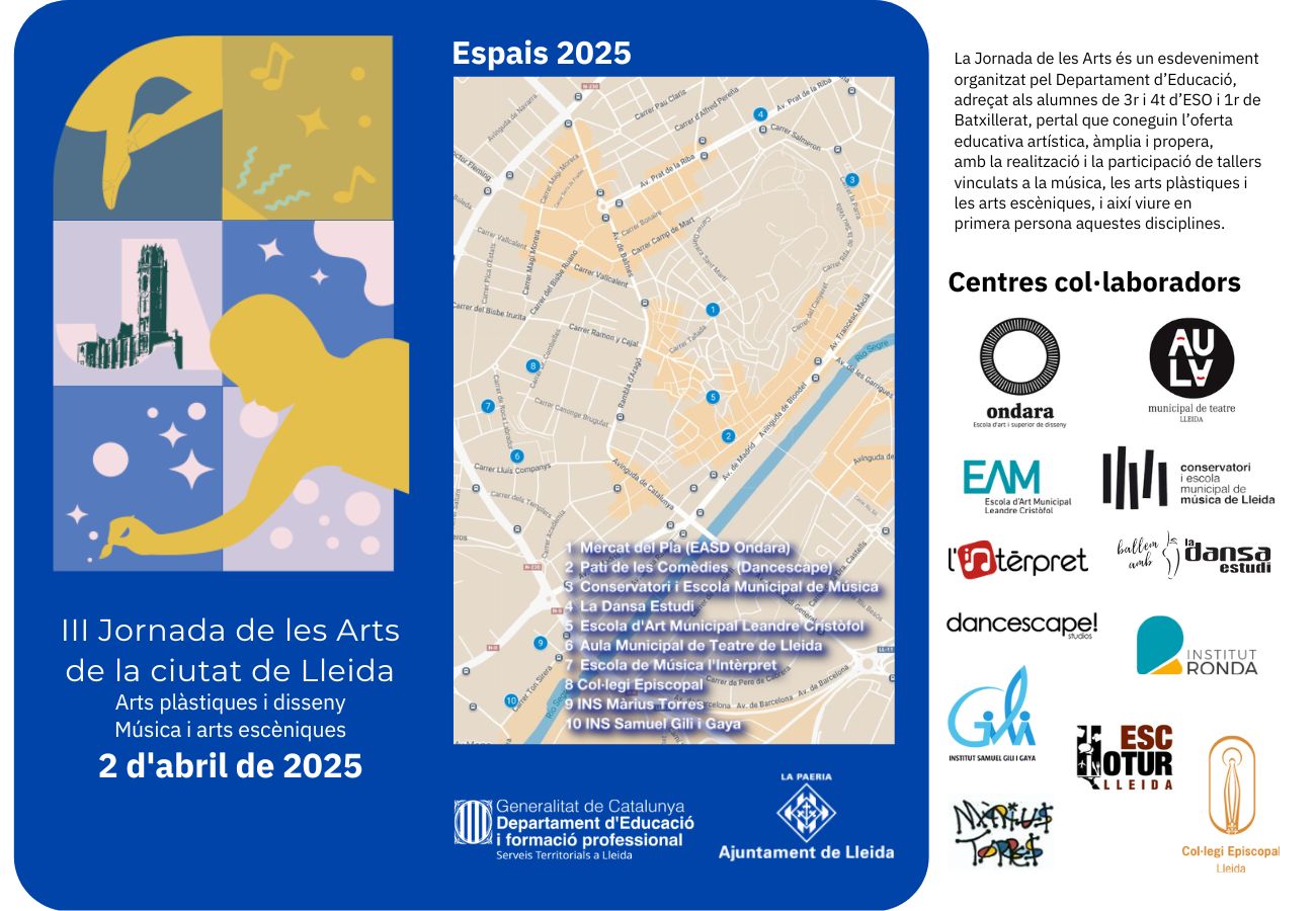 La Jornada de les Arts és un esdeveniment organitzat pel Departament d’Educació, adreçat als alumnes de 3r i 4t d’ESO i 1r de Batxillerat, per tal que coneguin l’oferta educativa artística, àmplia i propera, amb la realització i la participació de tallers vinculats a la música, les arts plàstiques i les arts escèniques, i així viure en primera persona aquestes disciplines.