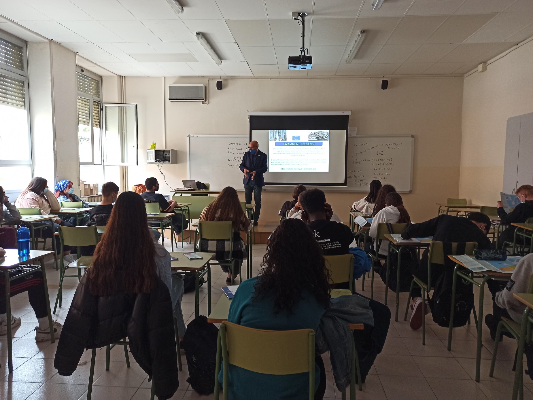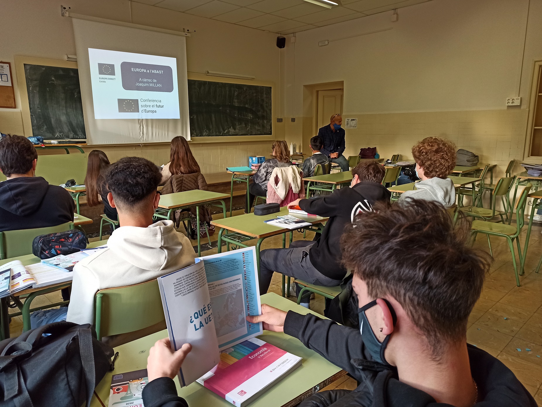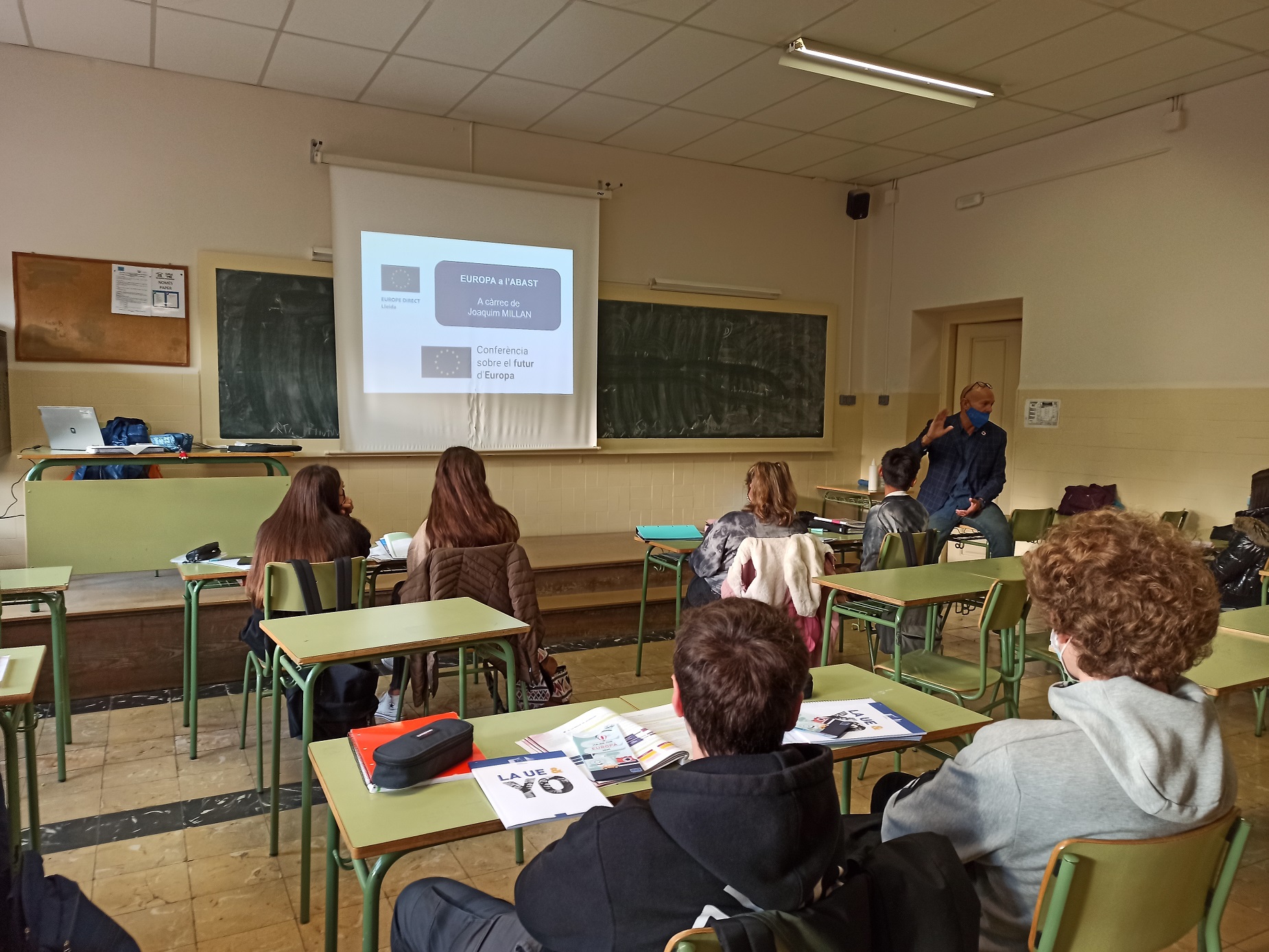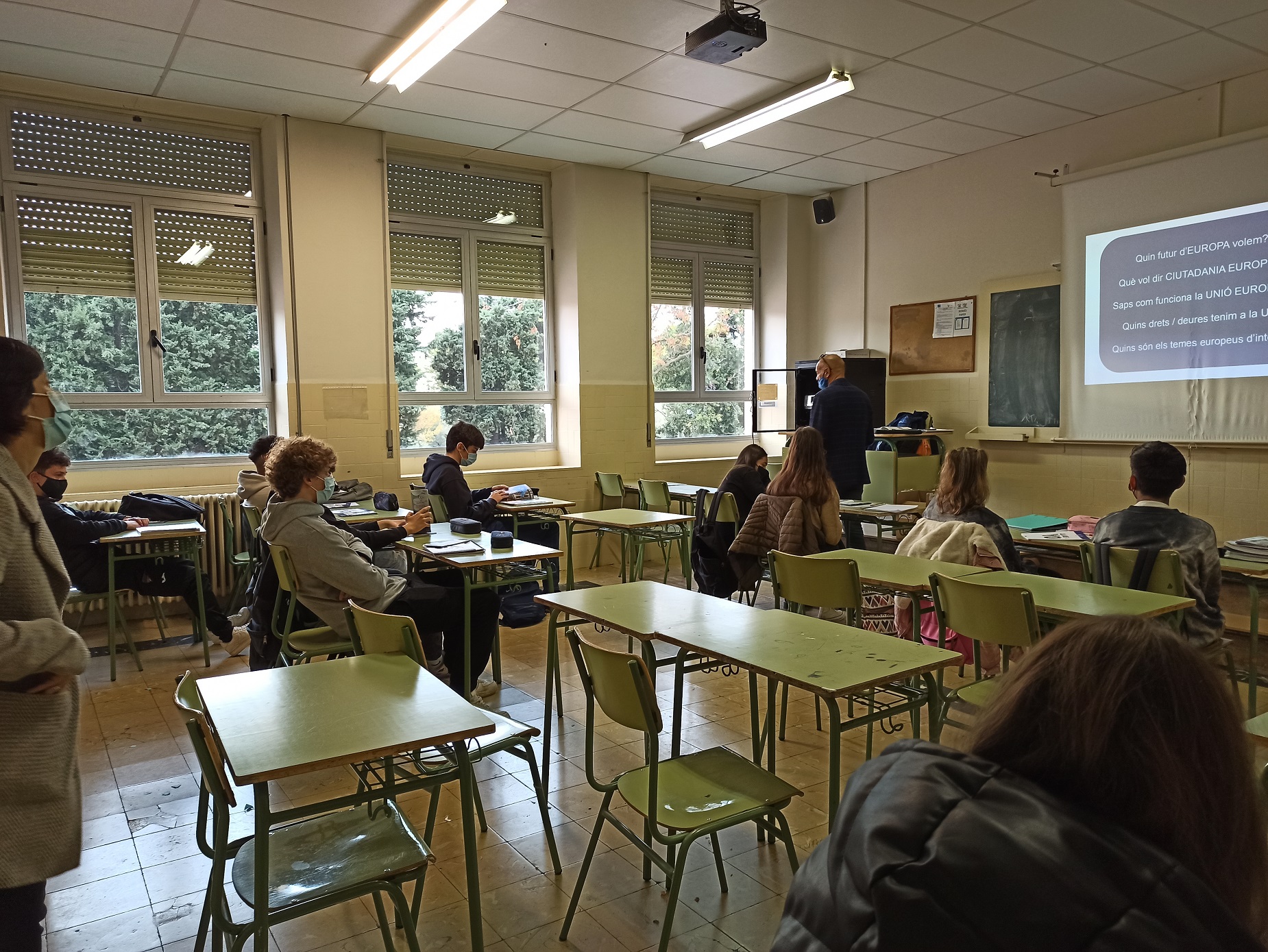 El divendres 29 d’octubre el senyor Joaquim Rullan, pertanyent a Europe Direct Lleida, impartí als alumnes de les matèries d’Economia i d’Història del món contemporani de 1r de Batxillerat dues conferències comentant els beneficis que reporta la Unió Europea a la ciutadania d’aquest país, a més, es centrà en l’impacte que les polítiques europees adreçades als joves i estudiants. Els animà a formar-se amb intensitat i profit, doncs en el proper mercat de treball aquest dos aspectes seran fonamentals.