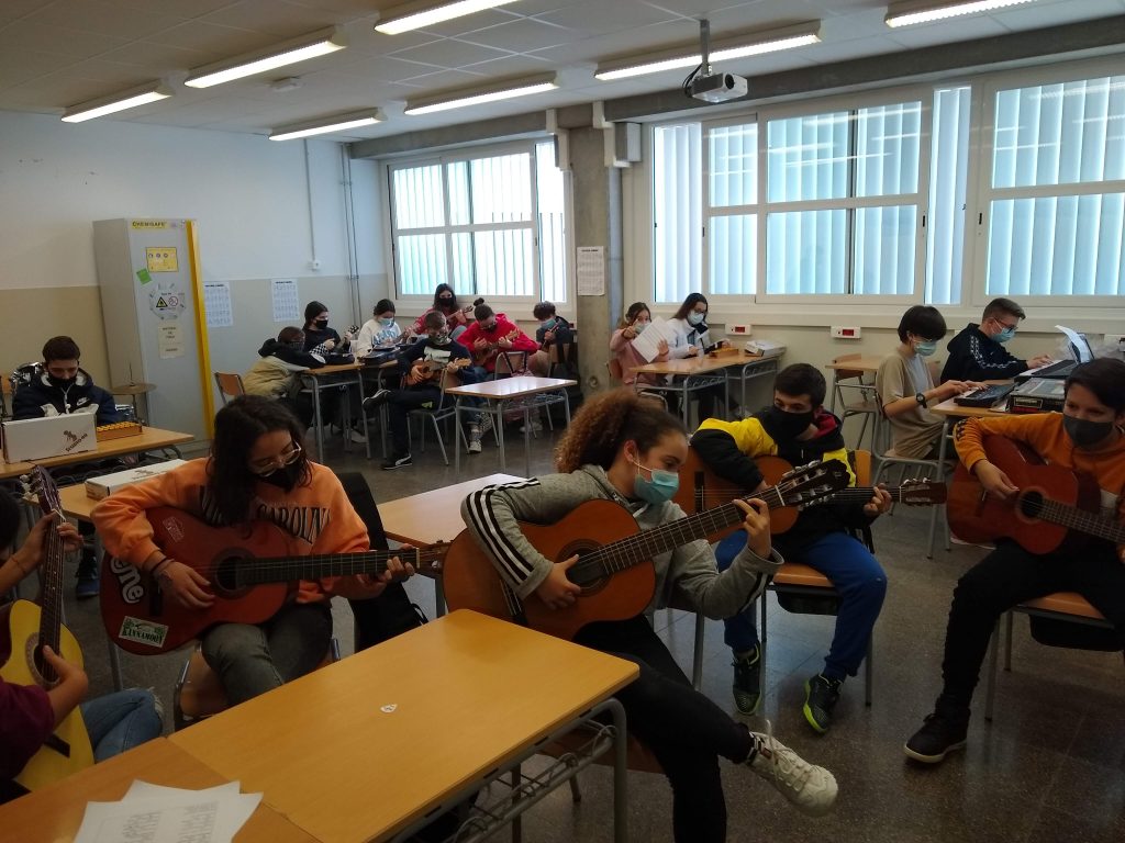 A les classes de música aprenem ritmes i fem música.
