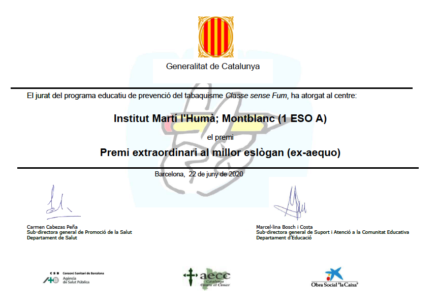 Els alumnes de primer d’ESO han participat al programa Classe sense fum. És un programa de prevenció del tabaquisme adreçat als alumnes del primer cicle d’ESO. Aquests signen uns compromisos que es van revisant durant el curs. A l’aula es fan assemblees, debats i treball relacionat amb el tabaquisme que culmina amb l’elaboració d’un eslògan […]