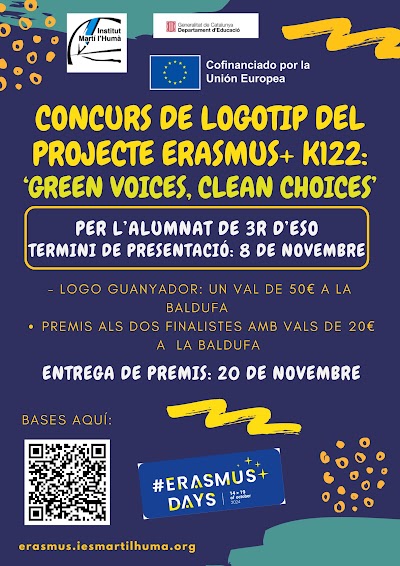 Aquesta setmana se celebren els Erasmus Days a tota Europa, per donar visibilitat a projectes Erasmus+. L’alumnat de 3r d’ESO, que és qui participarà al projecte ‘Green voices, clean choices’, està treballant aquesta setmana activitats sobre la Unió Europea i participaran al Concurs de Logotips per crear el logo que representarà el projecte Erasmus+ del