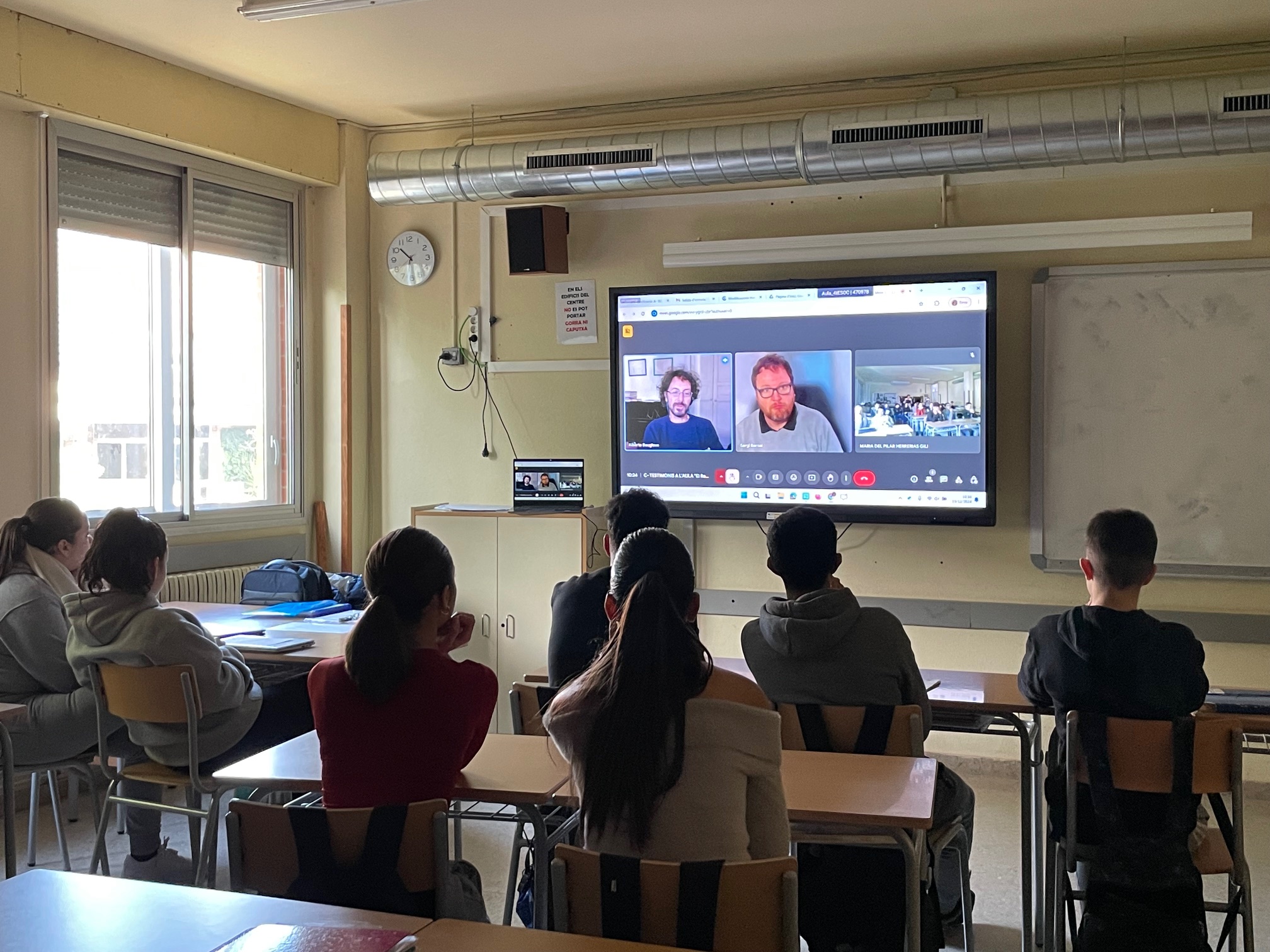 L’alumnat de quart ha gaudit aquests dies d’una xerrada de la història del mestre Benaiges explicada per Alberto Bougleux i Sergi Bernal responsables del documental El retratista, on s’exposa la història d’un jove mestre català, Antoni Benaiges, que fou destinat a una escola rural de Burgos. Des d’allà va projectar una nova educació pels seus alumnes. El seu somni es va trencar dramàticament quan, amb el cop d’estat, al juliol del 1936, va ser empresonat, afusellat i enterrat a una fossa comuna.