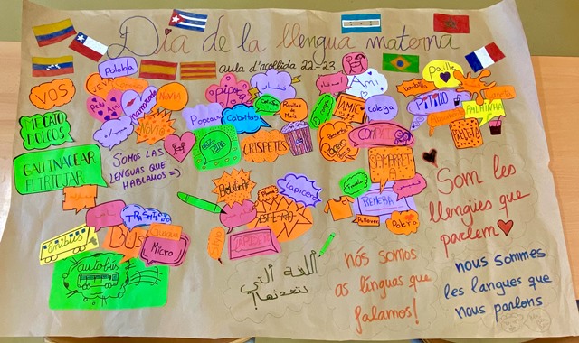El passat dimarts 21 de febrer va ser el Dia internacional de la llengua materna. Per celebrar-ho, els alumnes de l’aula d’acollida hem fet un gran cartell on hem estampat un conjunt de paraules que es diuen diferents en les llengües que conviuen a la nostra aula: espanyol de diferents països d’Amèrica i d’Espanya, portuguès, àrab, francès…