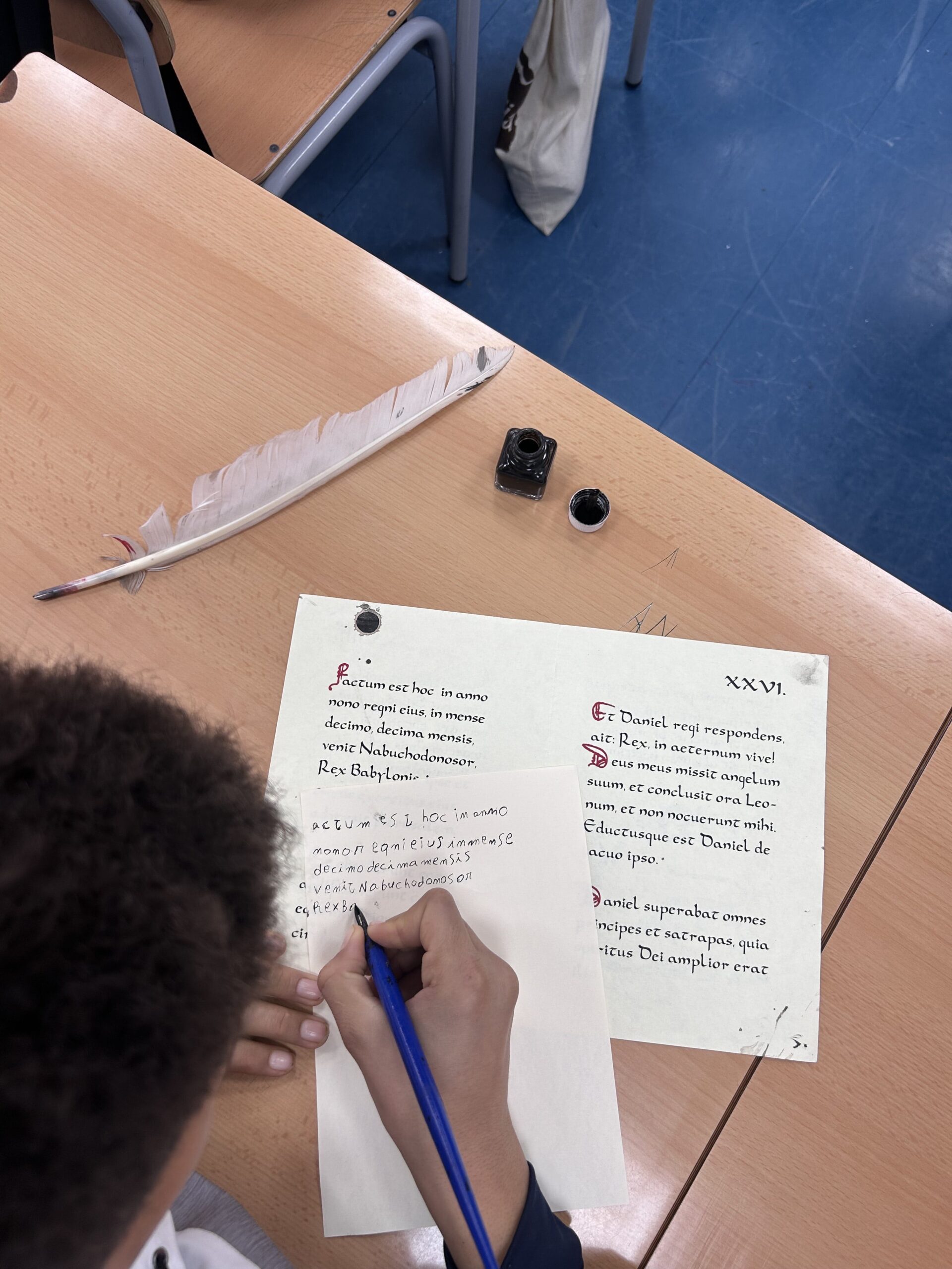 Avui els alumnes de 2n d’ESO han fet el taller Scriptorium, que consisteix a practicar l’escriptura medieval a través dels materials que es feien servir com el pergamí, les plomes i les tintes, aplicant diferents tècniques de l’època i participant també en la seva preparació.