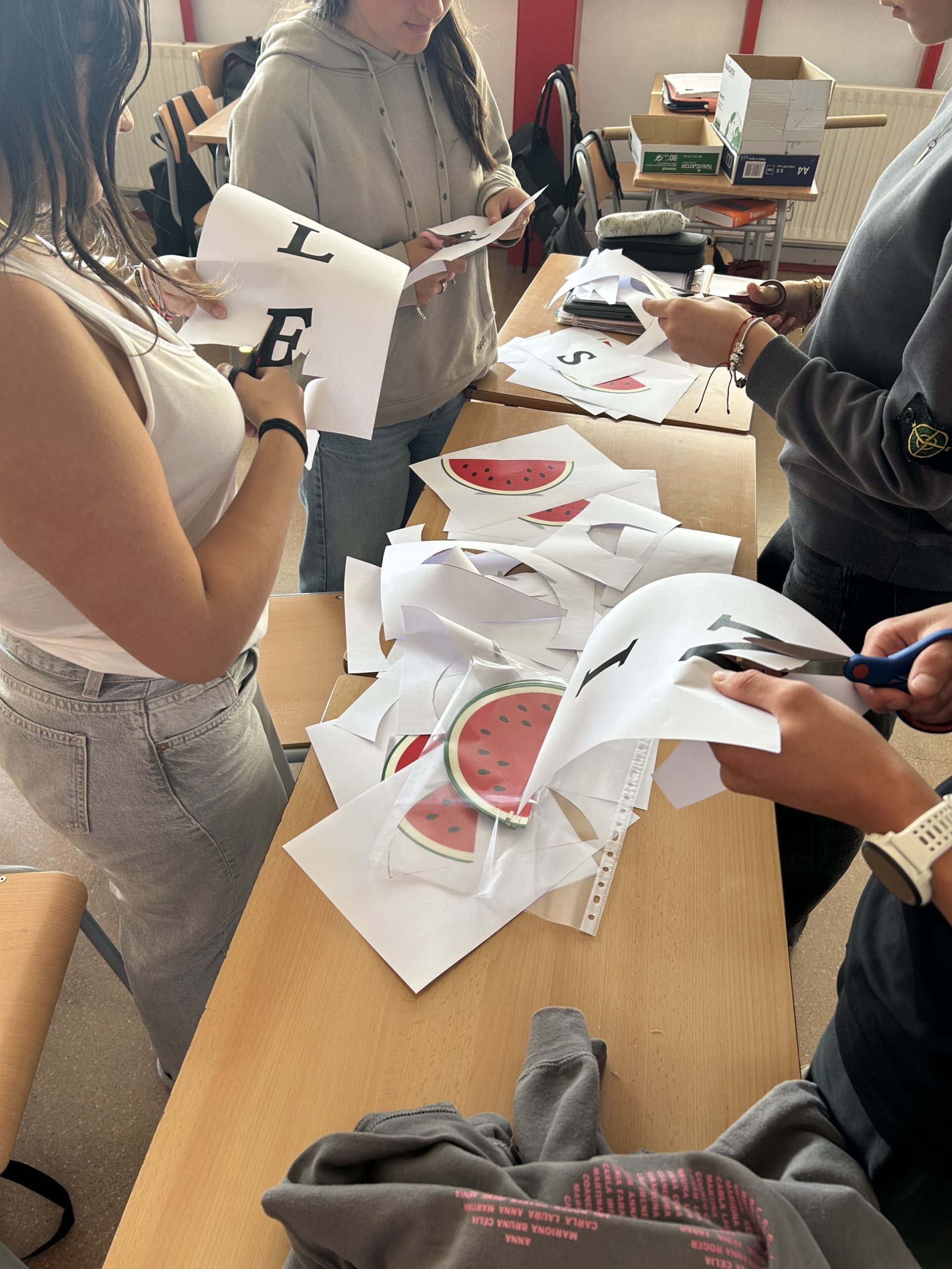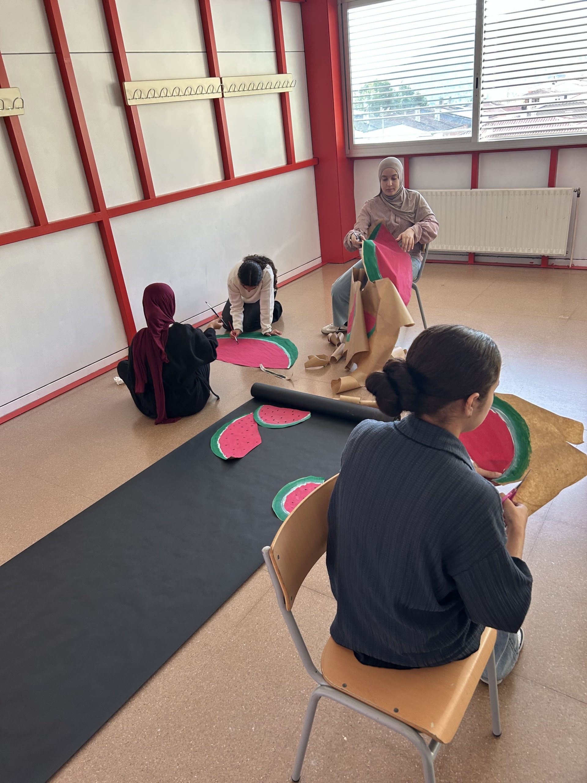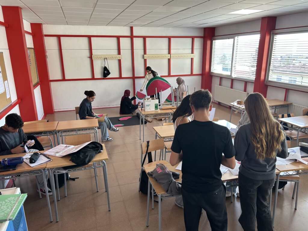 A l’institut treballem la cultura de la Pau, del Respecte i Solidaritat. Per aquest motiu, l’alumnat de Ciutadania, política i dret, junt amb el d’Educació en Valors Cívics i Ètics, hem preparat un mural per recordar la importància de garantir una societat justa per a tothom. Cal denunciar qualsevol crim que atempti contra els drets humans, drets que malauradament es violen arreu del món, com és el cas de l’Estat de Palestina.