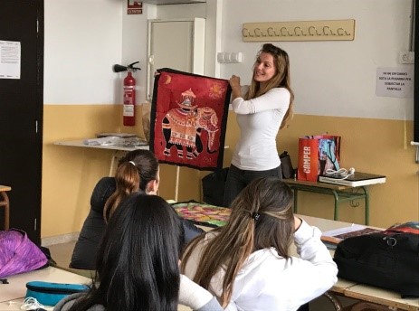 Els alumnes van elaborar un disseny a l’aula, treballant amb els materials i la instrumentació característics d’aquesta tècnica, es va utilitzar un teixit de cotó orgànic, material amb el qual treballa la dissenyadora, qui també és pot considerar una gran artista, ja que totes les peces de les seves col·leccions són úniques i pintades a mà.