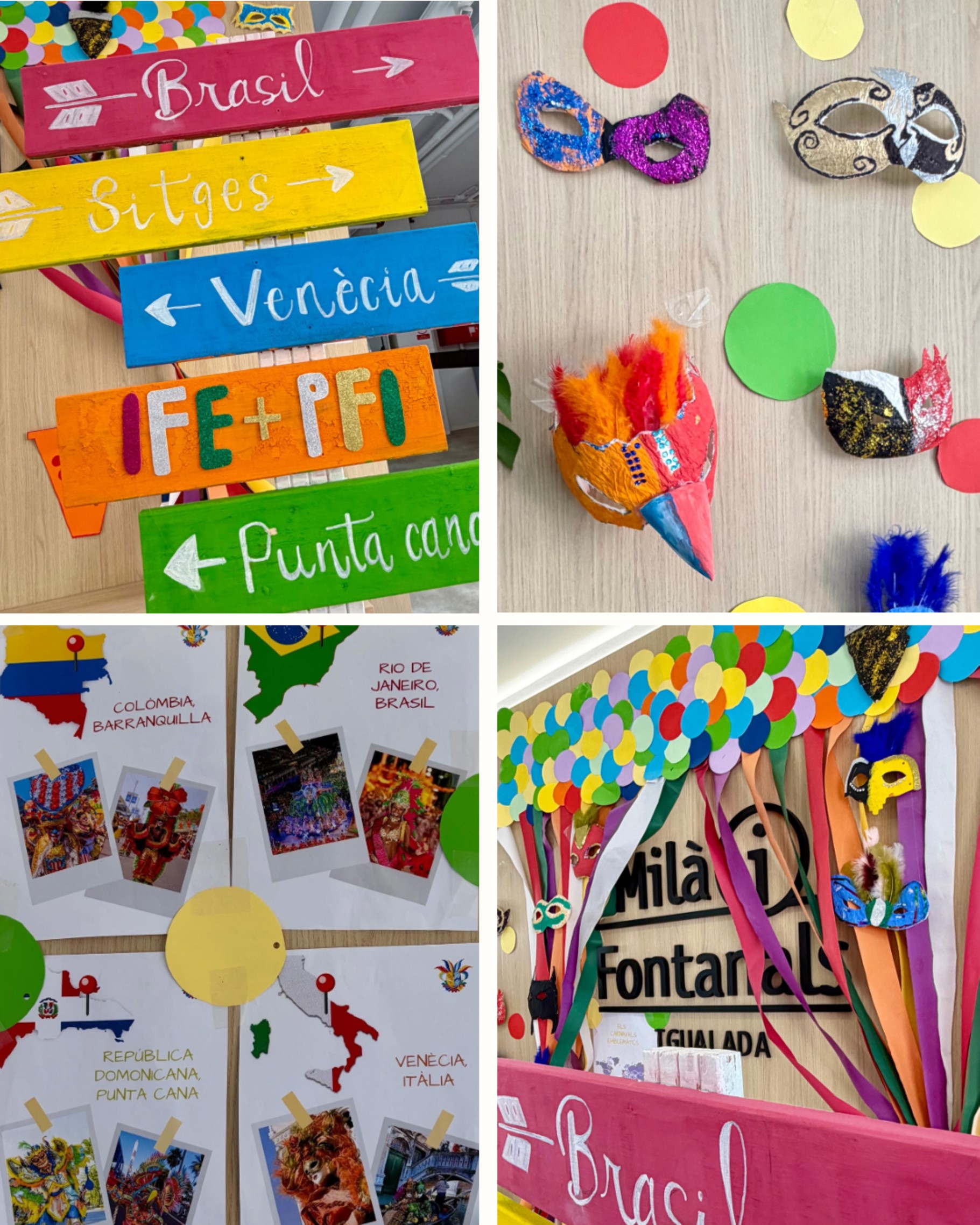 L’alumnat de PFI i IFE han decorat el hall del centre amb motiu del Carnaval, creant màscares, elements plens de color i imatges de les festes més destacades arreu del món, amb una menció especial a Sitges, propera al nostre centre.