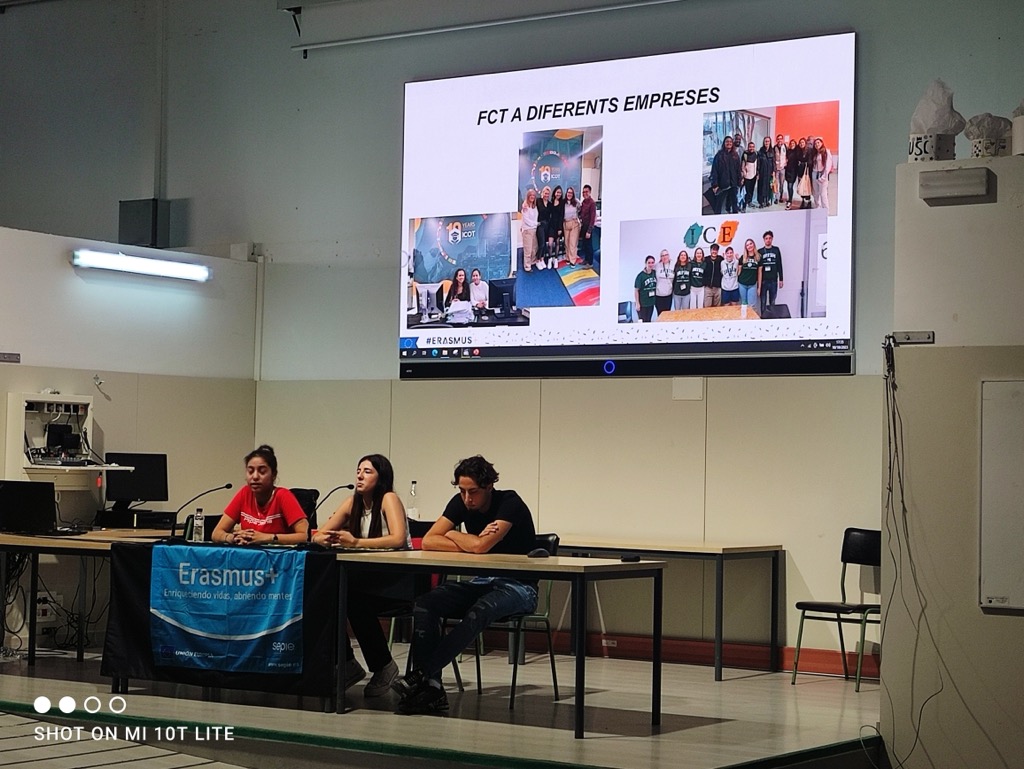També vam comptar amb el testimoni d’alguns alumnes que van realitzar una mobilitat el curs passat. Ens van explicar de primera mà les seves experiències al país d’acollida, van compartir amb el públic les impressions que van tenir mentre van viure en un país diferent i ens van fer cinc cèntims de les dificultats amb què s’hi van trobar. Fins i tot, vam contactar amb una alumna que en aquests moments està fent una estada a Dublín, Irlanda.