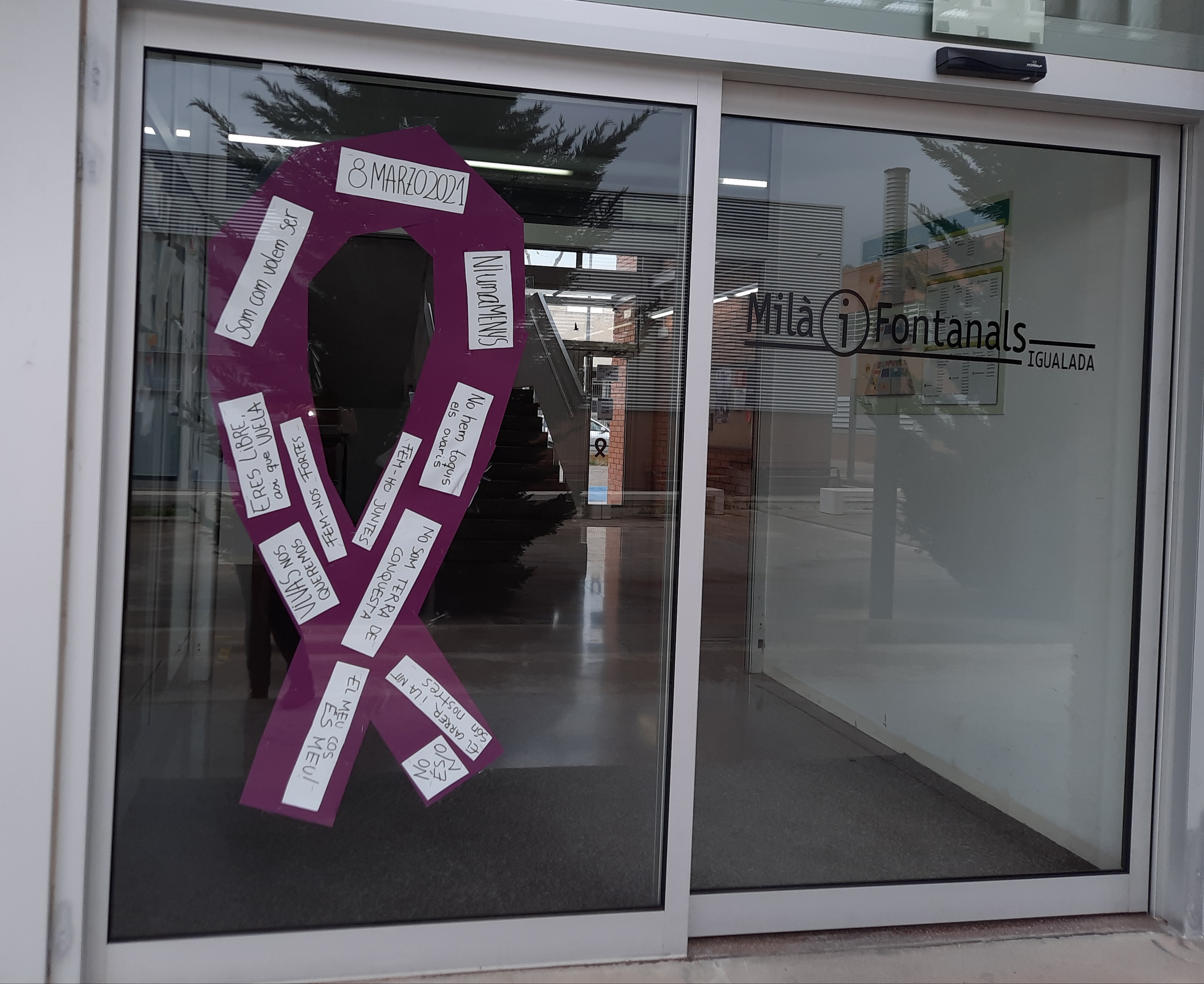 “Integració Social reivindica el 8M posant llaços i cartells en diferents espais del Milà. La lluita continua, més que mai. La Covid ens deixa més bretxa i més desigualtat. Lluitem contra la violència cap a les dones i defensem l’expressió i el dret de manifestació.”