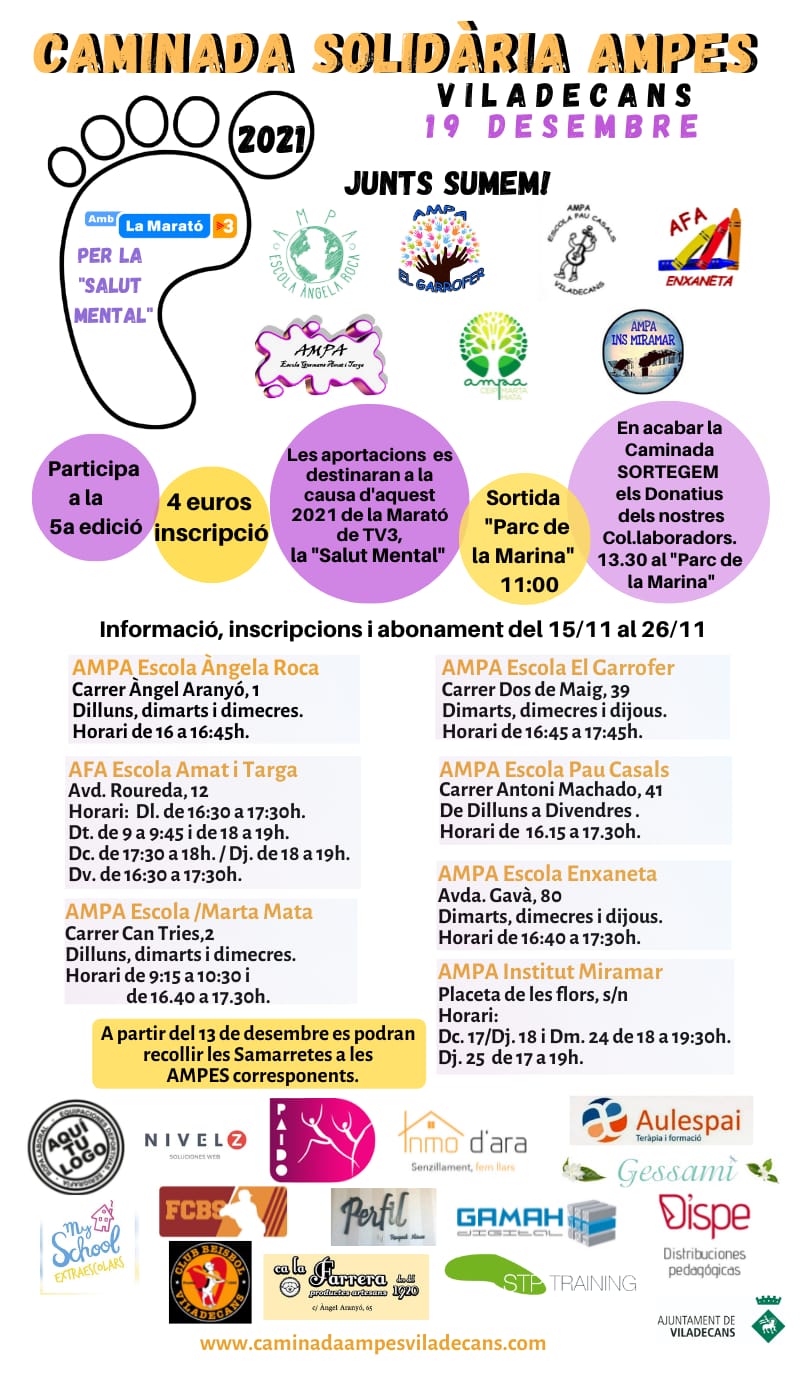 Us volem informar que la nostra AMPA està participant per primera vegada, juntament amb altres AMPES, en l’organització de la Caminada Solidà ria AMPES Viladecans. Aquesta és la cinquena edició i tota la recaptació es donarà a la Marató de TV3.