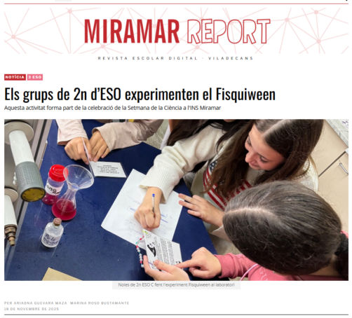 Des de la revista escolar digital, els alumnes de 3r d’ESO han fet una cobertura especial de les iniciatives que la Comissió STEM del centre ha preparat per celebrar la Setmana de la Ciència. A continuació, us presentem alguns exemples de notícies que corresponen a activitats dutes a terme en diferents cursos i nivells pel professorat dels departaments de Matemàtiques, Biologia i Geologia, Física i Química i Tecnologia.