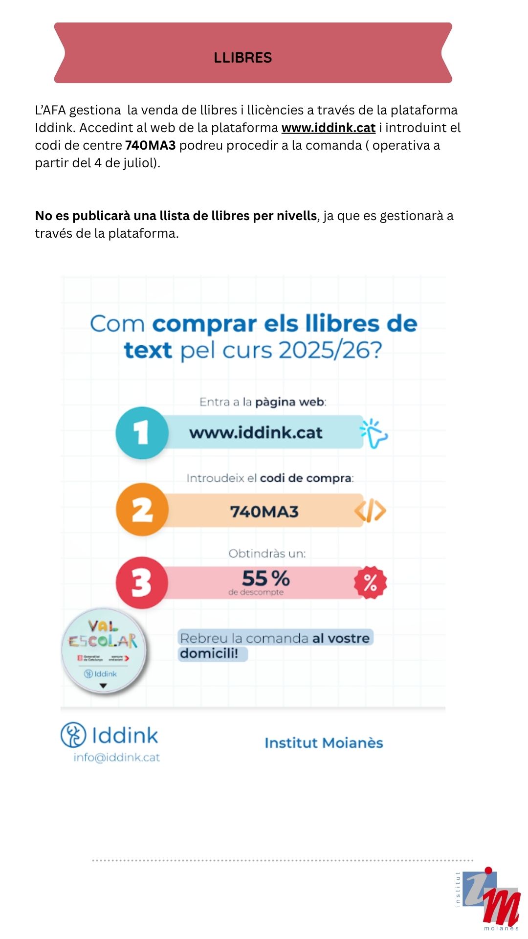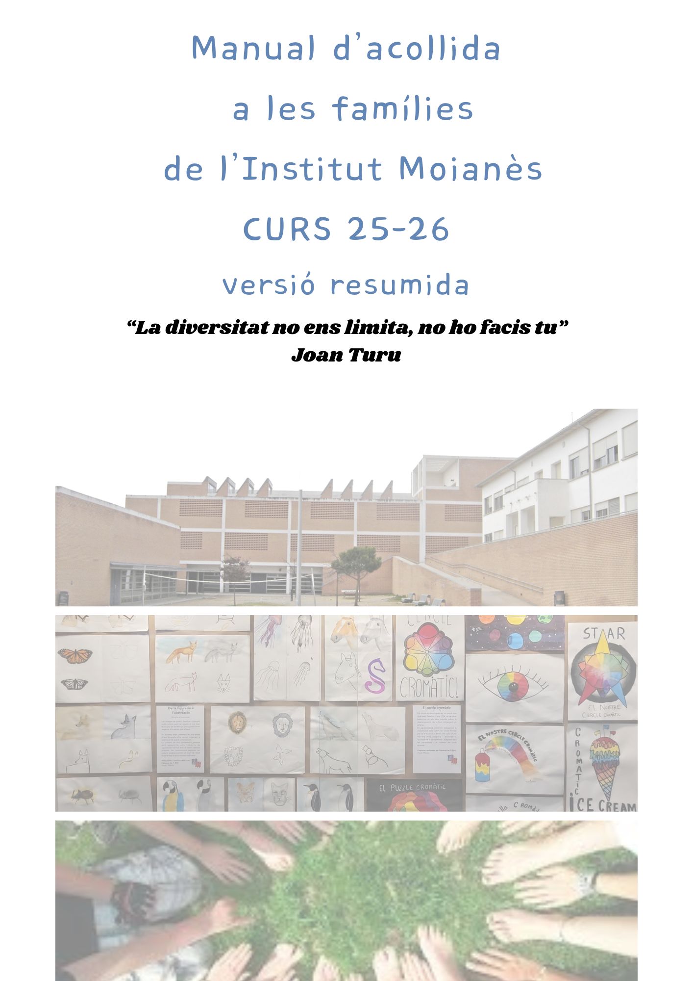 16/07/25En el següent enllaç accedireu al Manual d’Acollida de les famílies de l’Institut Moianès del curs 25-26. En aquest document hi trobareu informacions relatives al calendari , la normativa, el transport, el material del curs 25-26 on s’aprofundeix en algunes qüestions de funcionament del centre.