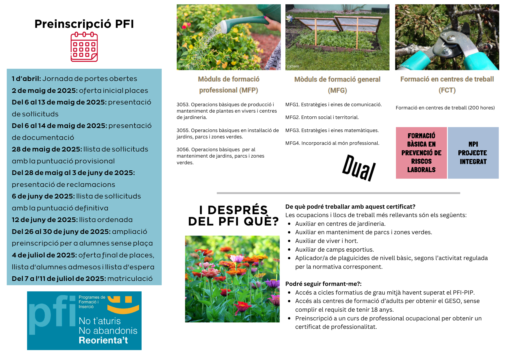 Aquest programa t’obrirà moltes portes!!! Podreu ser peó en horticultura, peó en fructicultura, peó en cultius herbacis i de flor tallada, de jardineria, de viver, de centres de jardineria, de camps esportius, peó de floristeria, auxiliar de magatzem de flors…. No dubteu en contactar amb nosaltres per qualsevol aclariment. Més informació.