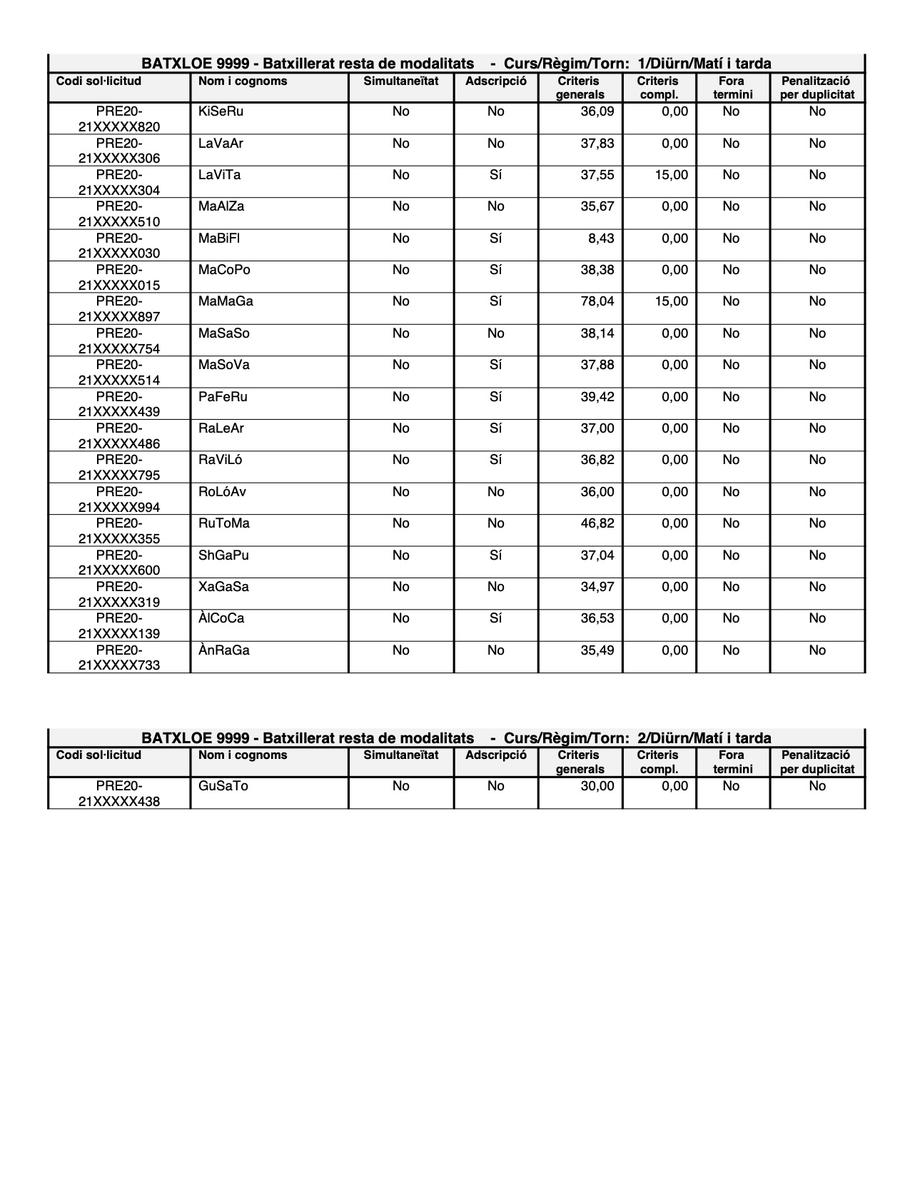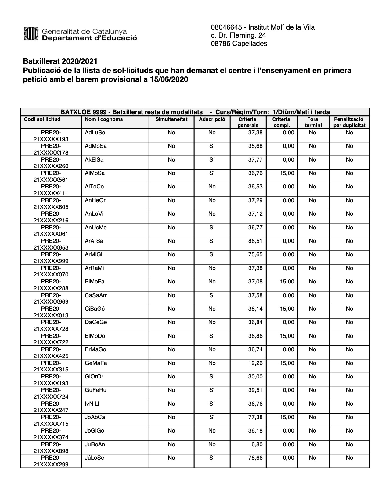 El codi de preinscripció tindrà el format PRE20-21XXXXX i els 3 darrers números del codi de la sol·licitud (exemple PRE20-21XXXXX323). Pel que fa al nom i cognoms, estarà format per les dues primeres inicials del nom, i les del primer i el segon cognom (exemple SuRoPo).