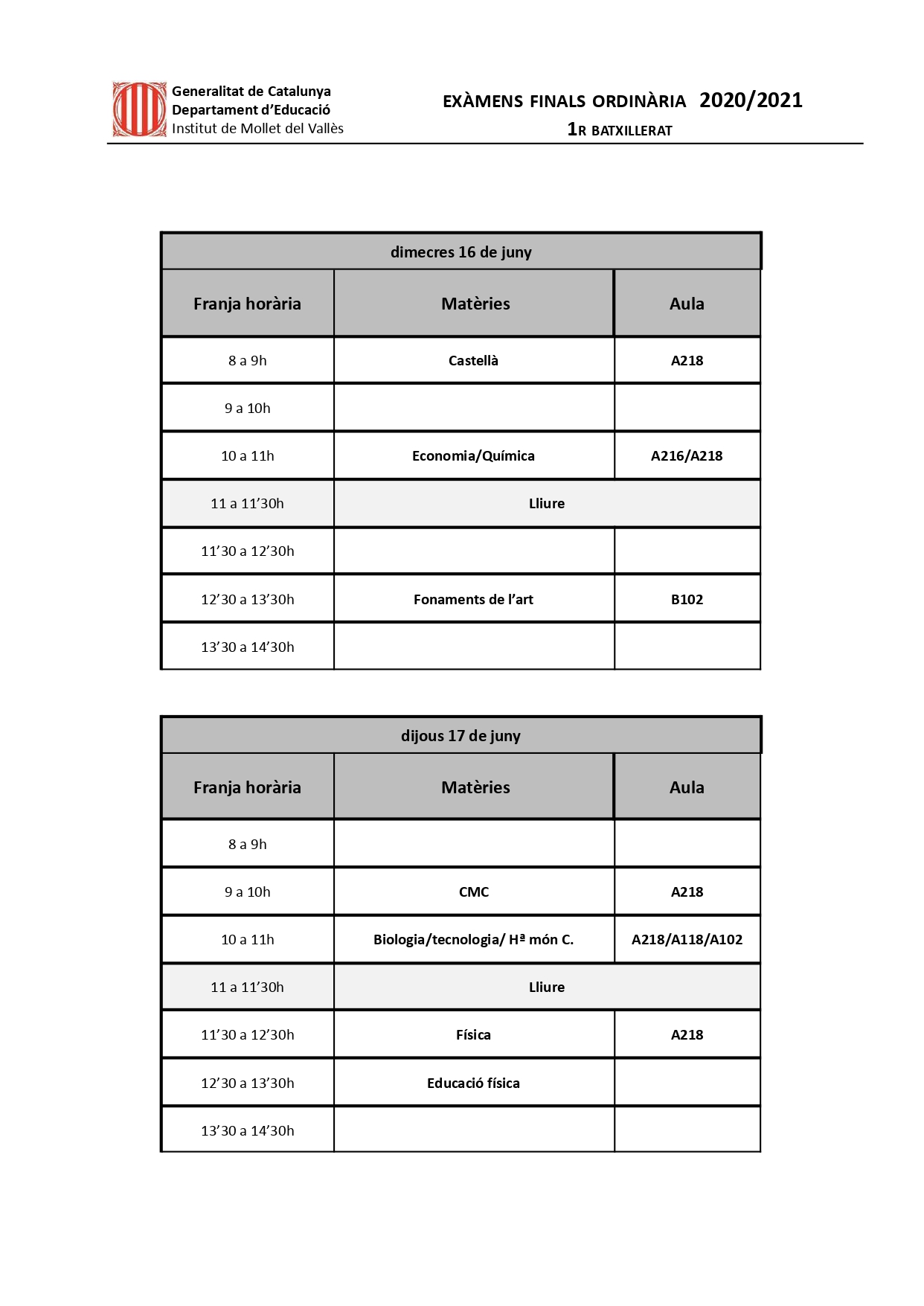 Horari exàmens finals 1r de BATX