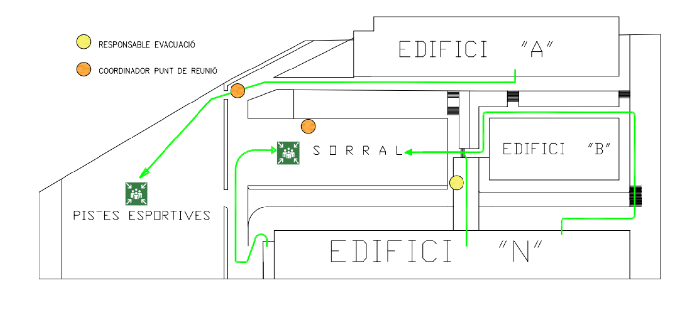 A l’edifici A i B, l’evacuació s’ha de fer per les escales més properes. Simultàniament, els ocupants de les altres plantes es mobilitzaran cap a les escales més properes, de manera ordenada, i respectant la prioritat de les classes anteriors i de les plantes inferiors.