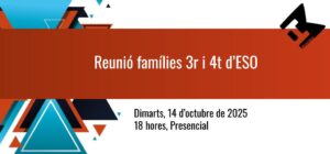 El proper dimarts, 14 d’octubre, tindrà lloc una reunió dirigida a les famílies per tractar sobre aspectes relacionats amb l’organització de tercer i quart d’ESO. Serà presencial, a les 18 hores.