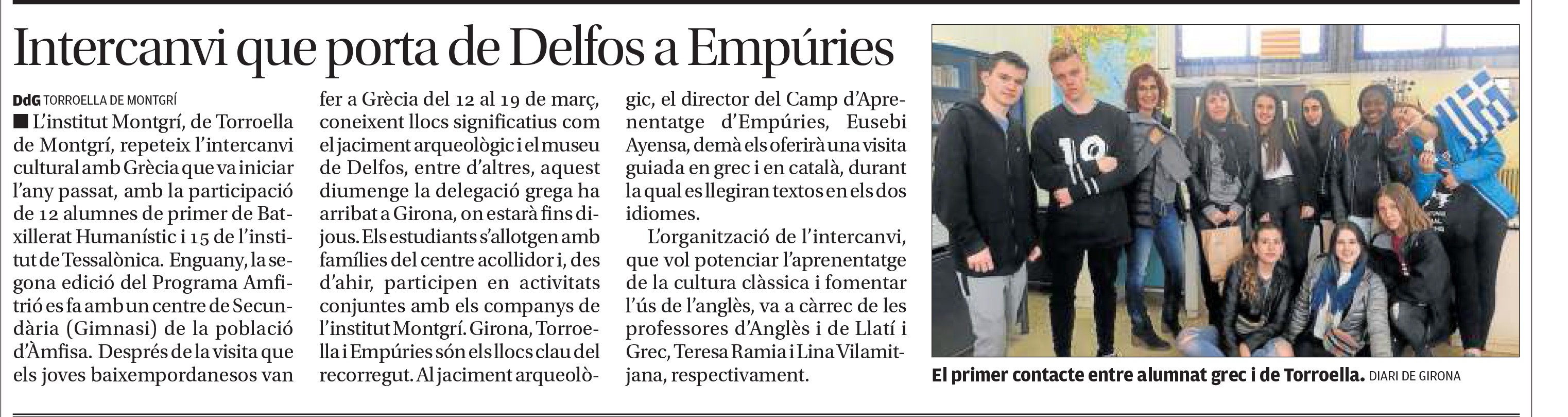 Aquesta setmana ens han visitat professorat i alumnes de la població d’Àmfisa a Grècia. Fa pocs dies eren els nostres alumnes i professores que els visitaven i ara són ells els qui han tornat la visita. Si l’any passat la població d’intercanvi fou Tessalònica, en aquesta ocasió ha estat Àmfisa. Els hem acompanyat al museu de la Mediterrània, d’excursió a les Medes, a Empúries i a Girona. Uns dies de convivència entre alumnes i famílies que han estat molt enriquidores. Els desitgem un bon viatge de tornada a casa!