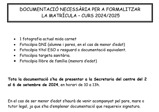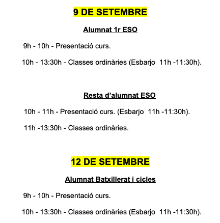 17/07/24Amb la finalitat de facilitar i millorar l’adquisició de llibres de text per al curs 24/25, la Direcció del centre oferta el projecte de socialització de llibres de 1r a 4t d’ESO. D’aquesta manera els nostres alumnes podran disposar de TOTS els llibres de text de… Llegeix més»