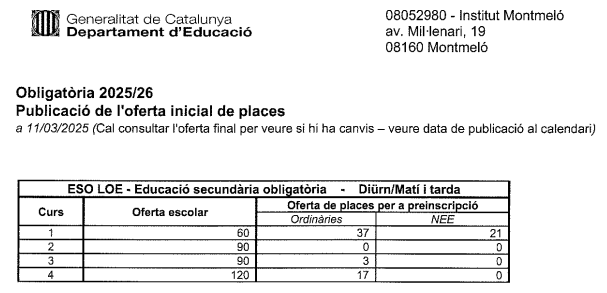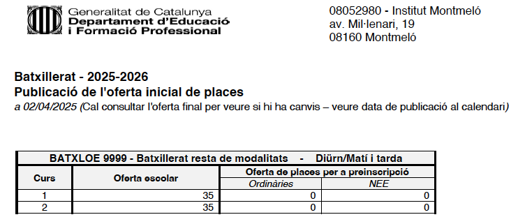 25/04/25Al següent enllça trobareu la llista de sol·licituds que han demanat el centre i l’ensenyament en primera petició amb la puntuació provisional a 24/04/2025.