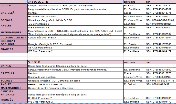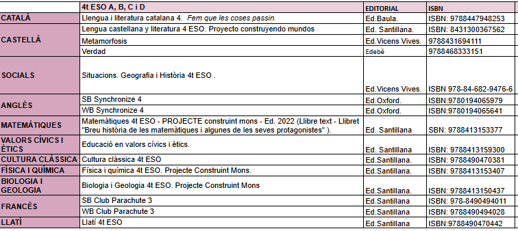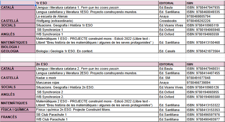 01/07/25Amb la finalitat de facilitar i millorar l’adquisició de llibres de text per al curs 25/26, la Direcció del centre oferta un nou projecte de socialització de llibres de 1r a 4t d’ESO. D’aquesta manera els nostres alumnes podran disposar de TOTS els llibres de text de manera més econòmica i senzilla.