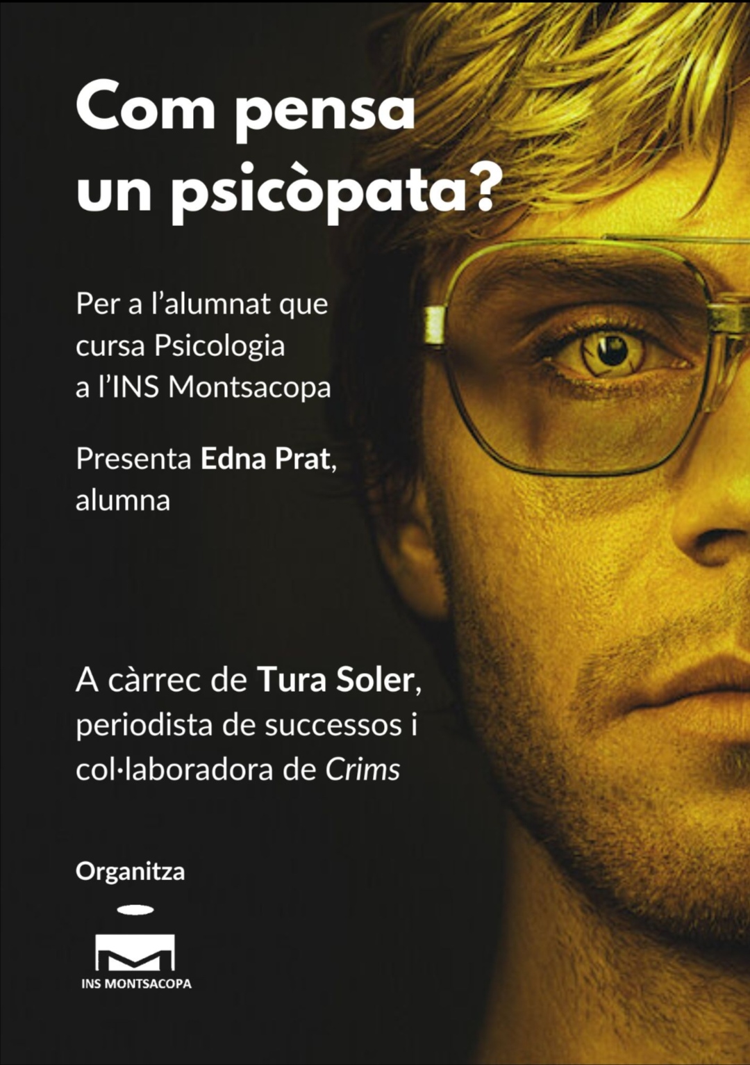 L’alumnat de l’optativa de Psicologia de primer de batxillerat rebrà una xerrada sobre la mentalitat dels psicòpates. La xerrada anirà a càrrec de la Tura Soler, periodista de successos i col·laboradora del programa Crims de Tv3. L’activitat s’emmarca dins de la unitat curricular de la Personalitat i, més concretament, dels diversos trastorns de personalitat. Els alumnes tindran preparades preguntes molt interessants per la Tura. Una activitat de prendre-hi partit!