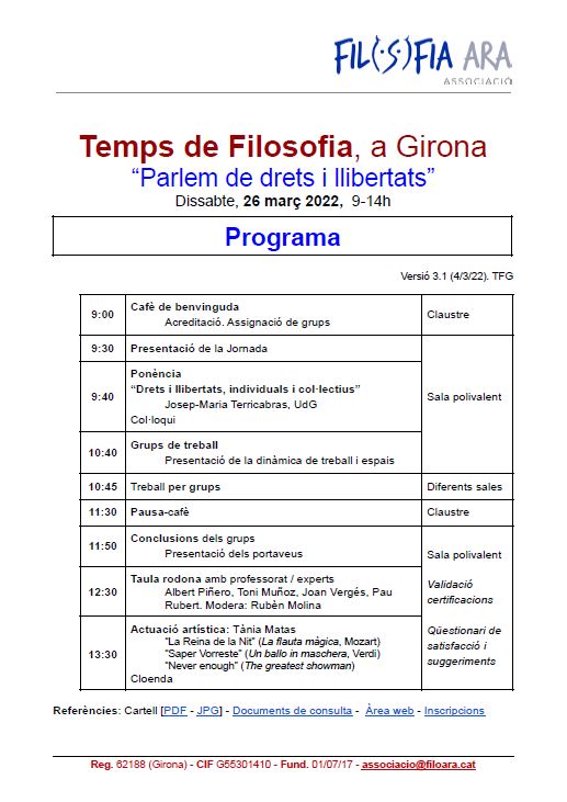 Activitat gratuïta, adreçada a l’alumnat interessat i oberta a la ciutadania en general. Cal inscripció prèvia. Per a més informació consulteu el programa, el cartell i aquest enllaç: https://sites.google.com/xtec.cat/filoara/tfg