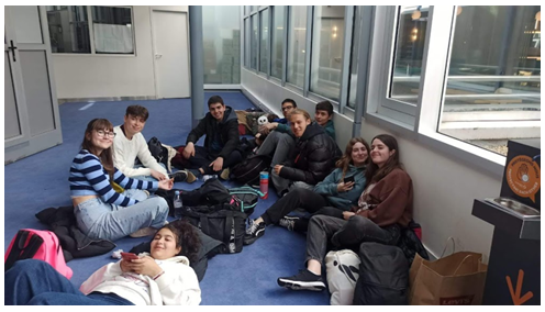 JOUR 9: Quand je me suis réveillée, j’étais très fatiguée. J’ai préparé toutes mes affaires et, ayant mangé un peu, nous sommes allés au lycée, où on devait prendre le bus. Là, nous nous sommes dit “adieu” et on est parti. Dans le bus, les gens ont mis de la musique tandis que le chauffeur était en train de nous emmener à l’aéroport de Nantes. Là, on a joué aux cartes et parlé entre nous jusqu’au moment où nous sommes entrés à l’avion, où il y a eu beaucoup de turbulences. Quand on a fini ce voyage, nous sommes allés chercher nos valises pour prendre l’autre bus. Là, on a mis de la musique une autre fois et on a chanté.