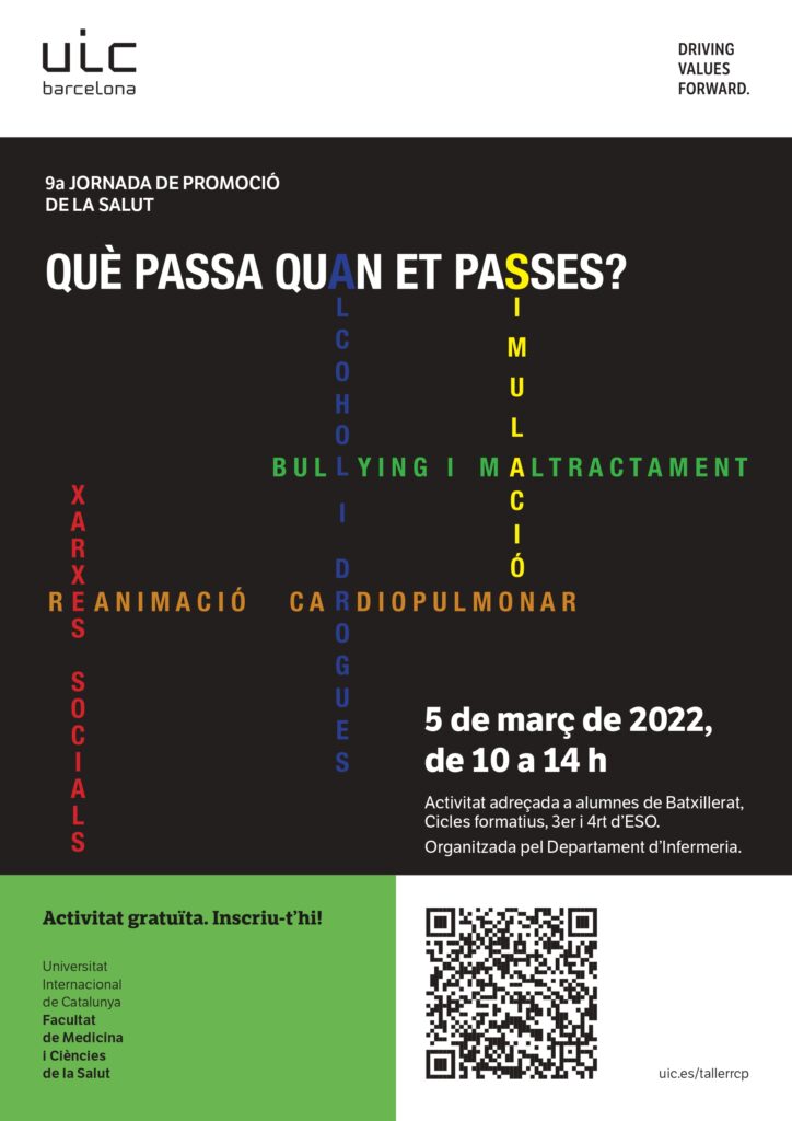 El Departament d’Infermeria de UIC Barcelona us vol convidar a participar a la 9a Jornada de Promoció de la Salut dirigida a alumnes de 3r i 4t curs de l’ESO, batxillerat i cicles formatius de centres educatius de tota Catalunya.