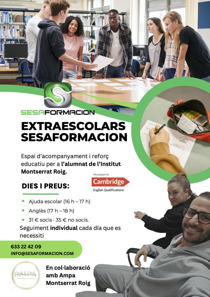 EXTRAESCOLARS PER L’ALUMNAT DE L’INSTITUT MONTSERRAT ROIG Administrador de la Web13/03/26 L’AMPA de l’institut col·labora amb l’Extraescolars de Sesaformacion, un espai d’acompanyament i reforç per al nostre alumnat.
