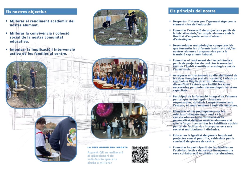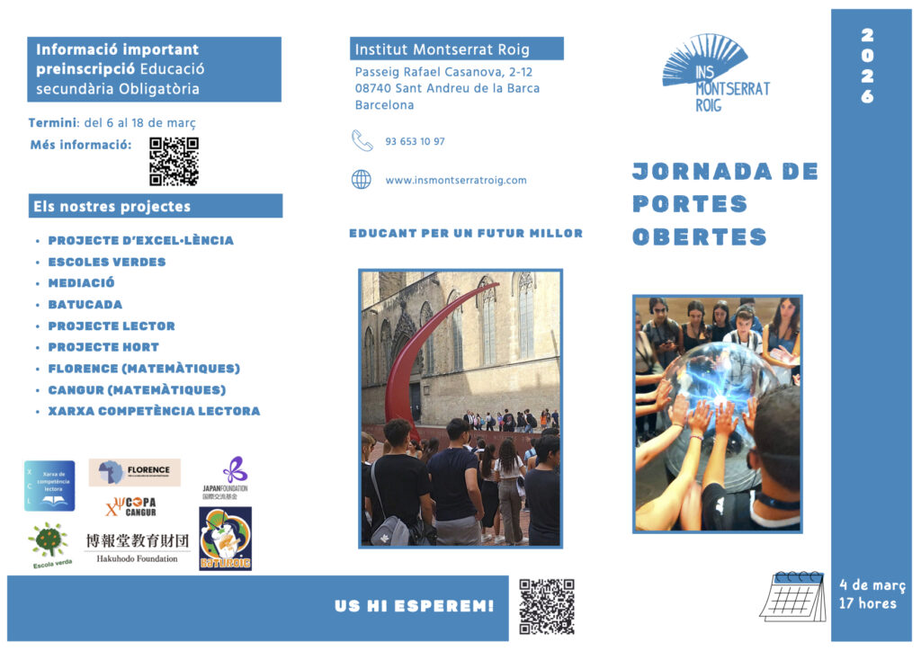 El dimecres 4 de març, a les 17:00 hores, tindrà lloc la Jornada de Portes Obertes del nostre institut. Convidem a les famílies que estiguin en situació de preinscripció dels/les seus/ves fill/es a venir presencialment, per visitar les nostres instal·lacions i conèixer el nostre projecte educatiu. Us hi esperem!