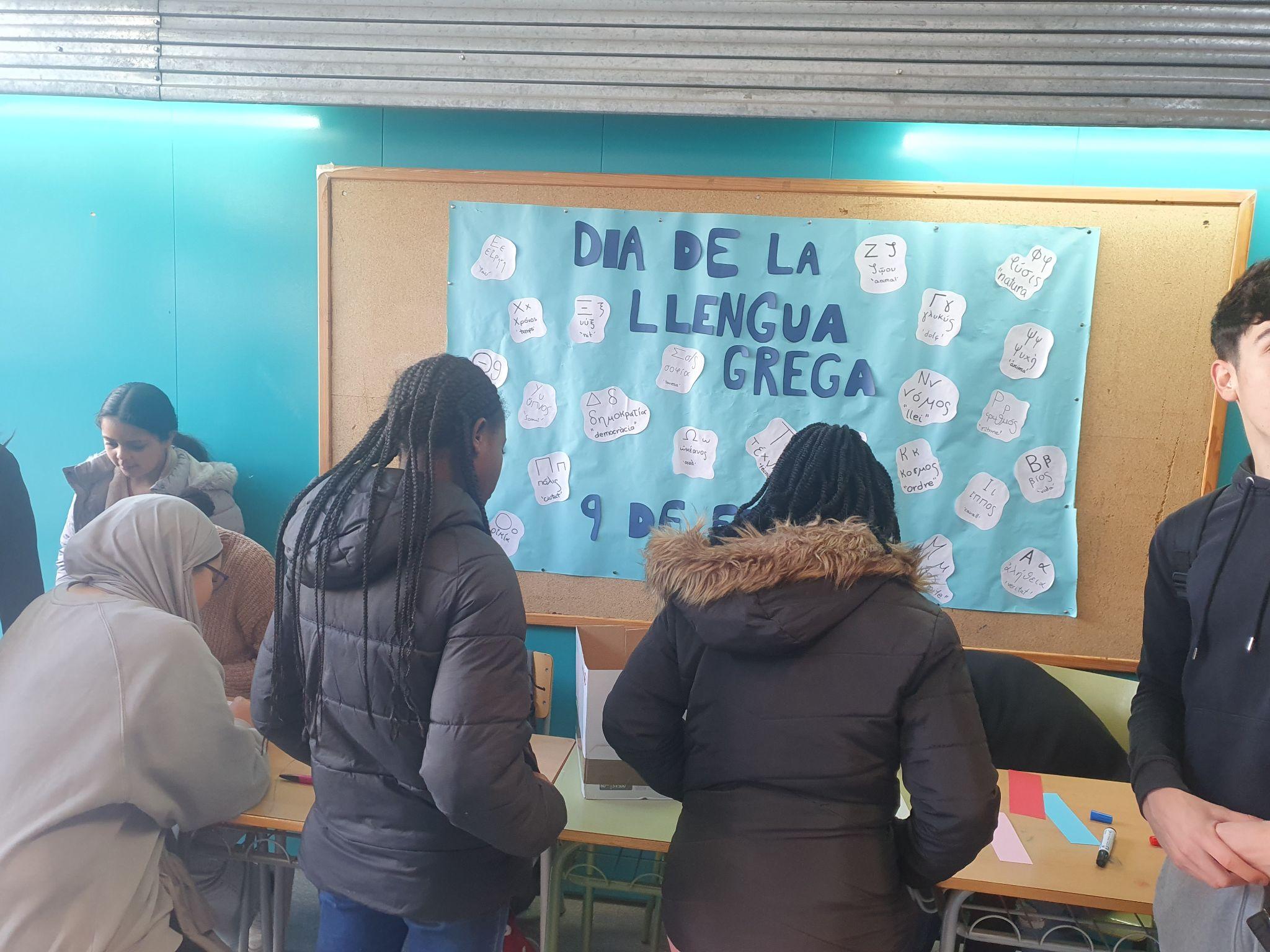El dia 9 de febrer és el dia de la llengua grega. Per celebrar-lo, l’alumnat del projecte d’excel·lència va preparar un mural amb paraules catalanes que provenen del grec i l’alumnat de Grec de 1r de batxillerat va fer una paradeta de punts de llibre on escrivien el nom de qui venia amb l’alfabet grec.