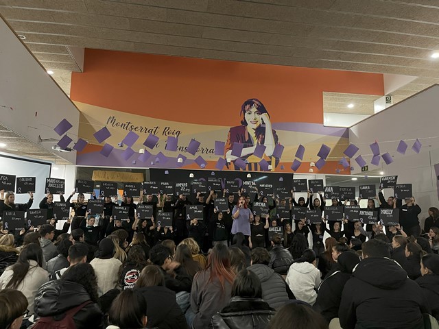5. Finalment, tots els grups es varen rejuntar al hall, i es va portar a terme l’acte de clausura, que consistia en la interpretació solemne de la cançó “Ni una más” d’Aitana, cantada per Montse Picó, mentre s’exposaven els diferents noms de les dones assassinades aquest 2024, víctimes de violència de gènere.