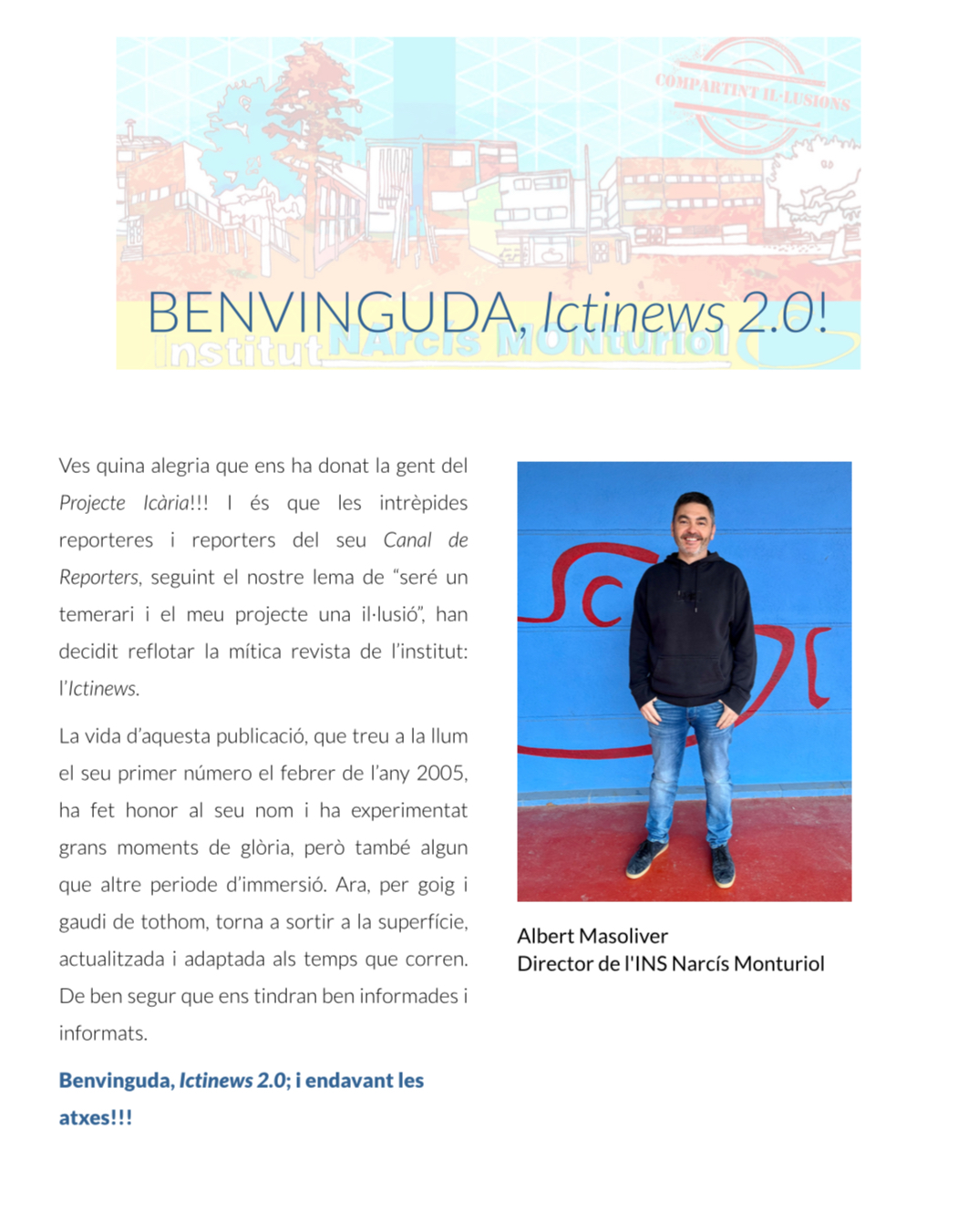 El dia a dia de les nostres estimades cantineres. Les primeres llavors del nostre projecte Dalí, amb visita a la Casa Natal Salvador Dalí i xerrada amb Mariona Seguranyes. Els 10 anys de Pastorets del Monturiol: conversa amb Ernest Pibernat. El TDR: un malson? En parlem amb 3 alumnes de 2BAT. Missatge de benvinguda del nostre director Albert Masoliver. Ens interessem pel barri i els seus límits amb l’Anna i en Manel, presidenta i vicepresident de l’AAVV Eixample Figueres, i les regidores Pilar Sánchez i Martina Prat. Concertem visita a l’Ajuntament de Figueres i entrevistem a Jordi Masquef… això i molt més a la Revista Ictinews 2.0.