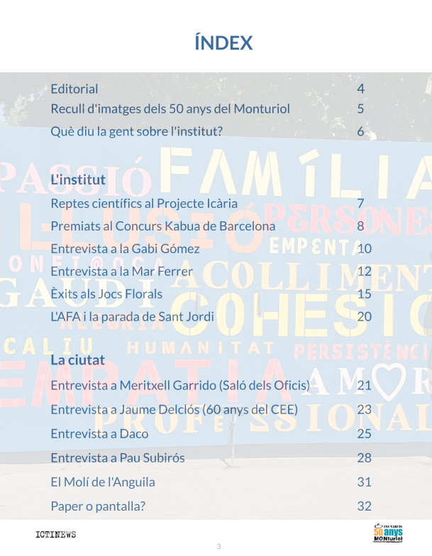 L’equip de Projecte Icària us presenta la publicació número 4 de la Revista Ictinews 2.0, tancada a finals del curs passat. En aquesta quarta edició, s’ha posat el focus, sobretot, en els actes dels 50 anys de l’institut (imatges, entrevistes, vídeos…), però també hem pogut conversar amb persones destacades que, d’una manera o una altra, fan ciutat.