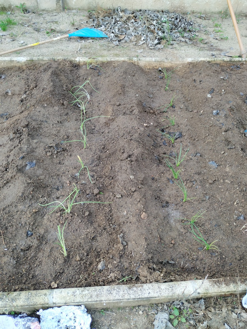 En tercer lloc, vam decidir fer el pas a les verdures. Vam plantar cebes de dos tipus: ceba blanca i ceba vermella. Abans de plantar vam remoure la terra de la zona perquè havia quedat molt dura i vam marcar dues fileres on plantaríem les cebes.