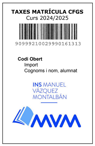 Codi de barres per a fer el pagament de taxes (només si has finalitzat la matrícula, consulta els preus i terminis en secretaria)